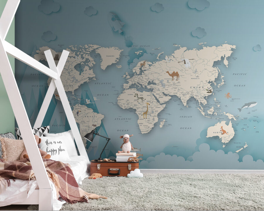 Dive into a world of imagination with this whimsical wall mural featuring a charming camel on a map. Perfect for sparking curiosity, this piece brings a fun twist to your little one’s space. Picture them dreaming of adventures across continents, surrounded by playful illustrations. The soft colors create a calming atmosphere, while the cute animals peek out, ready to be discovered. Whether it’s a cozy reading nook or the main wall in a playroom, this mural transforms any area into a journey of exploration. Who knows, it might even inspire a future globetrotter!