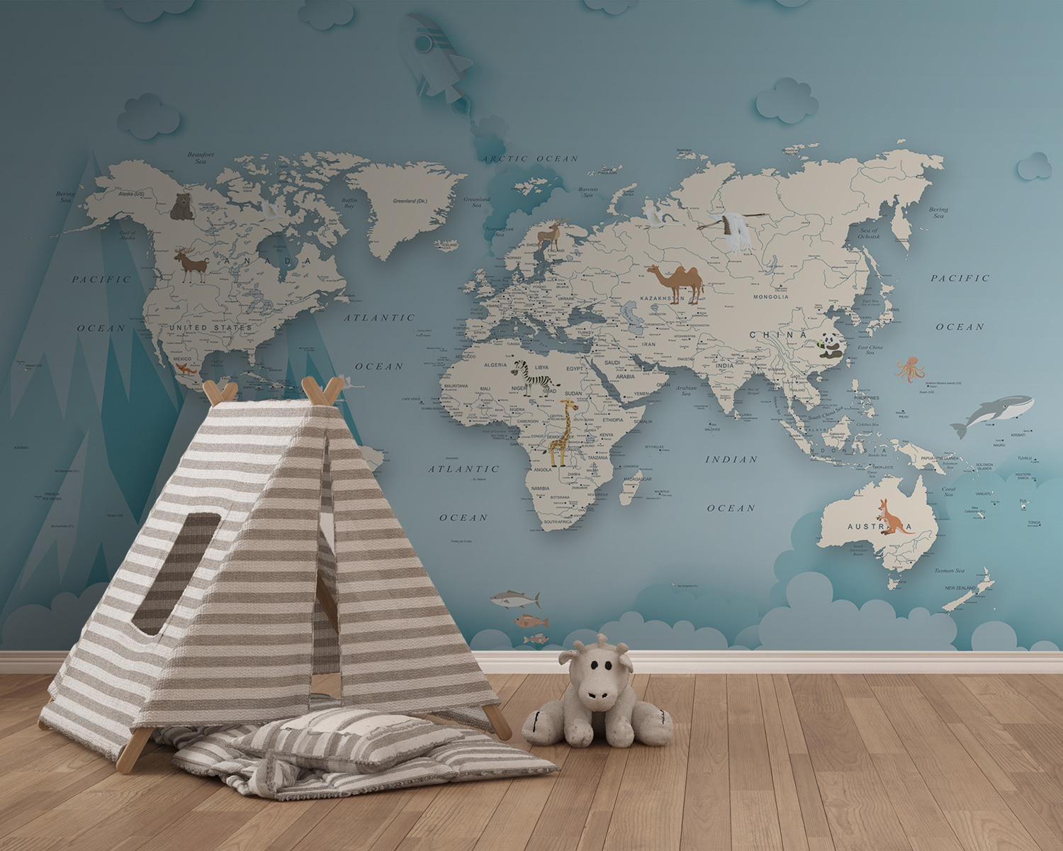 Dive into a world of imagination with this whimsical wall mural featuring a charming camel on a map. Perfect for sparking curiosity, this piece brings a fun twist to your little one’s space. Picture them dreaming of adventures across continents, surrounded by playful illustrations. The soft colors create a calming atmosphere, while the cute animals peek out, ready to be discovered. Whether it’s a cozy reading nook or the main wall in a playroom, this mural transforms any area into a journey of exploration. Who knows, it might even inspire a future globetrotter!