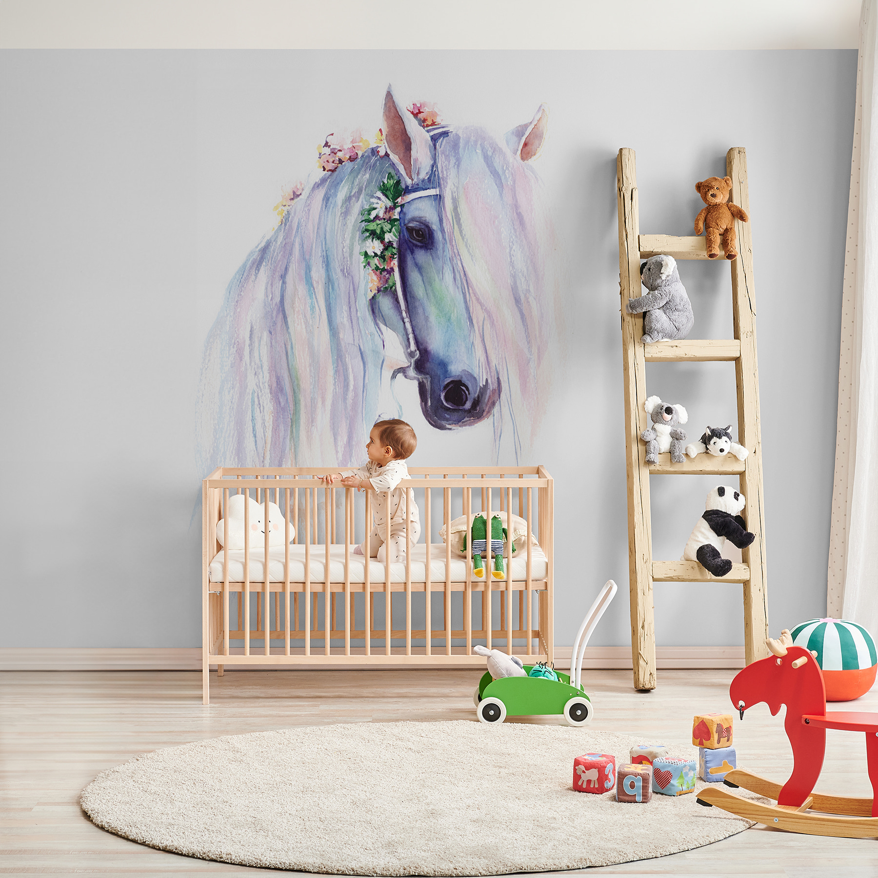 Transform any room into a dreamy haven with this stunning mural featuring a majestic horse draped in flowers. Picture it—a room where little ones can let their imaginations gallop freely while surrounded by the gentle grace of this enchanting creature. The soft, swirling colors offer a calming backdrop that might just inspire daydreams about magical adventures or a picnic in the meadow. It’s perfect for a nursery or playroom, adding just the right touch of whimsy and nature’s beauty. Guests will be charmed, and kids? Well, they’ll surely feel like they’re part of a fairy tale. Who knew a wall could spark such joy?