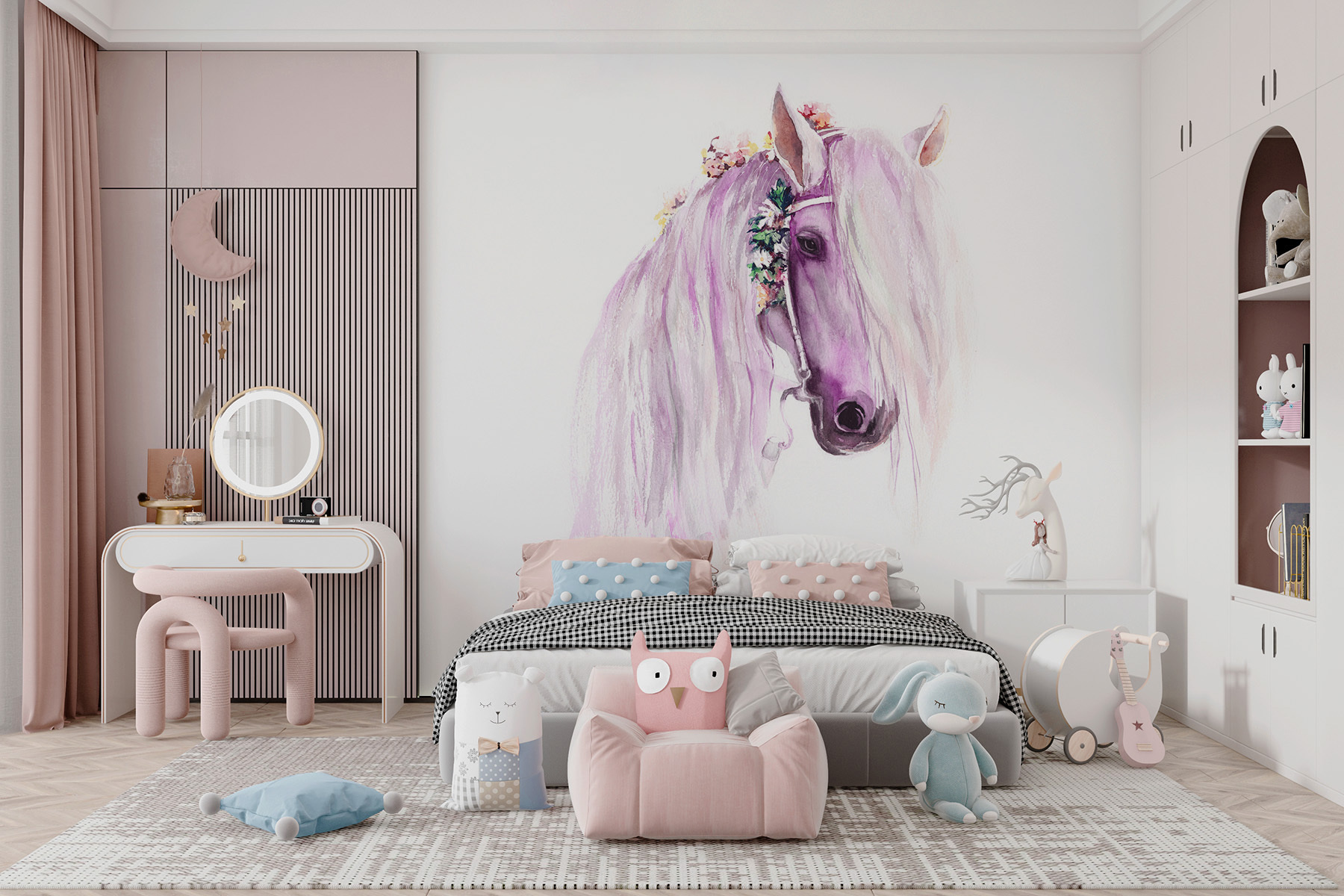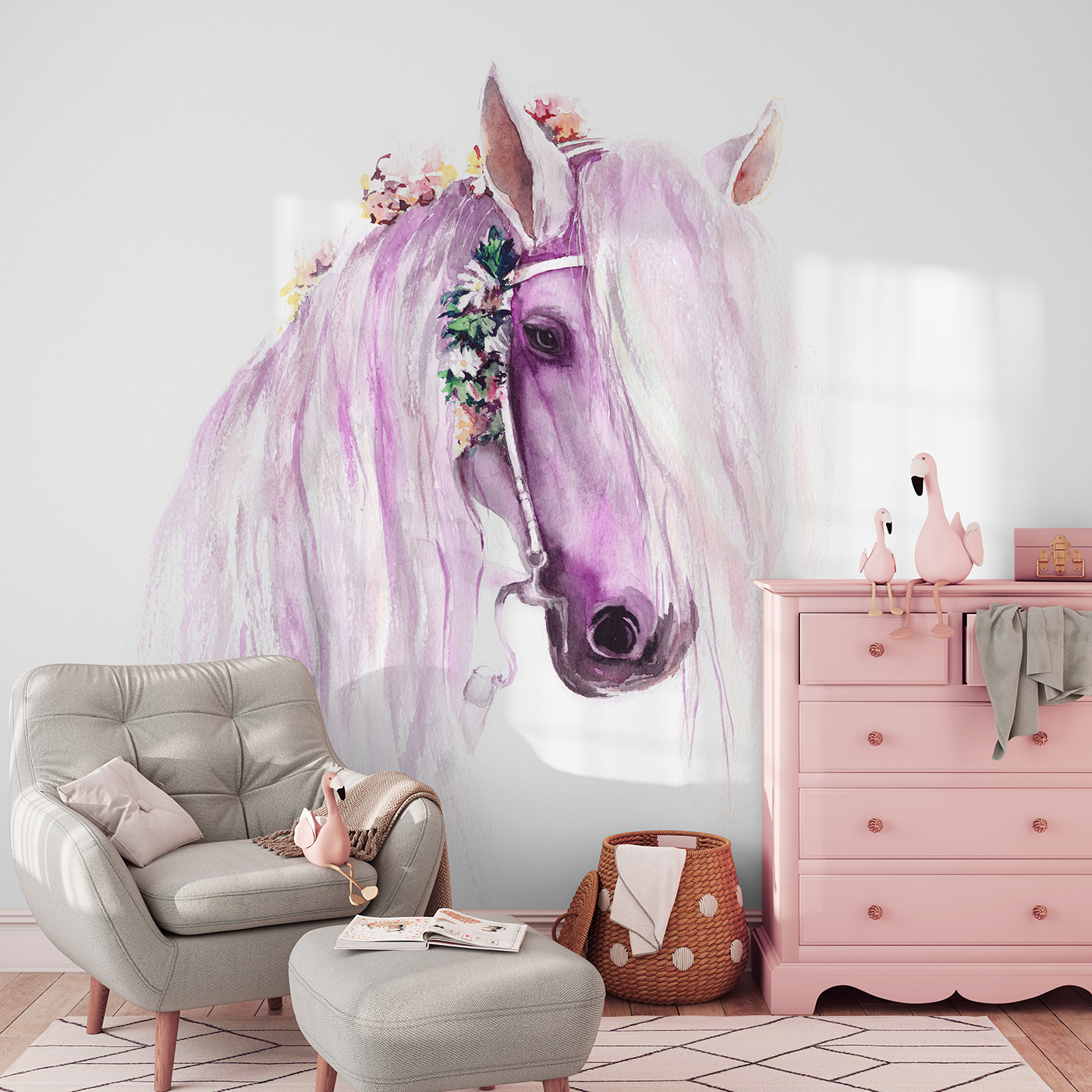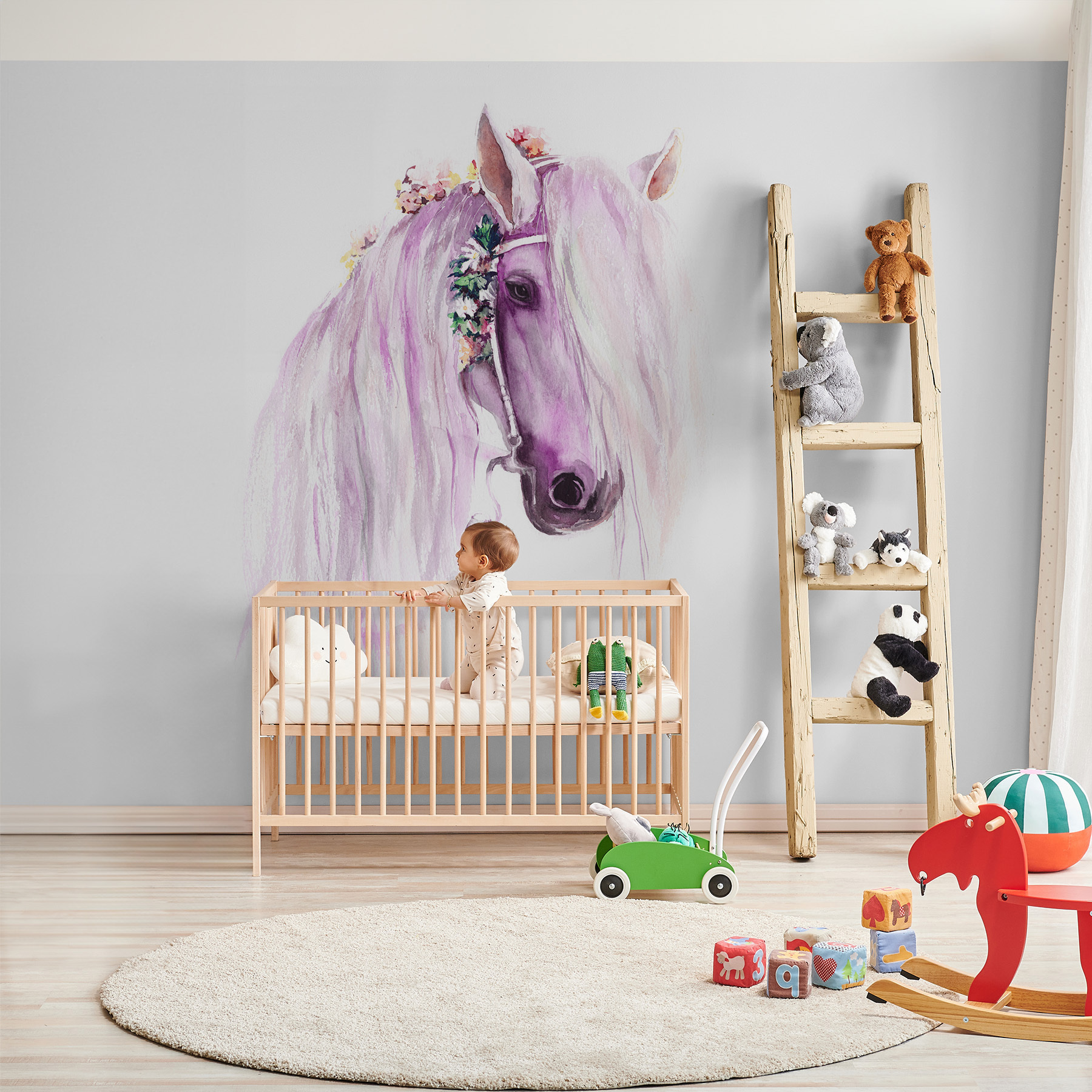 Transform a child’s space into a whimsical wonder with this enchanting watercolor mural of a horse. It’s like having a friendly companion watching over their adventures. The soft, flowing mane and gentle expression bring a touch of magic to the room, inviting daydreams of galloping through fields and chasing rainbows. Imagine the giggles and stories inspired by this graceful creature. The pastel hues blend easily with any decor, making it a perfect addition to bedrooms or play areas. This mural isn’t just decor; it’s a spark of imagination.