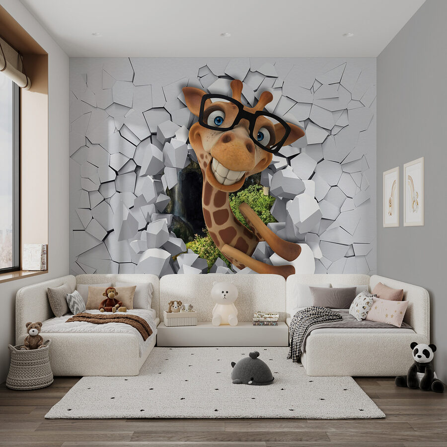 Transform your space with this playful mural featuring a giraffe sporting glasses—because who wouldn’t want a stylishly quirky buddy in the room? It’s not just a decoration; it’s an instant conversation starter. Imagine guests wandering in, doing a double-take at this charming character bursting through the wall. The bright colors and delightful expression add a splash of joy to any dull room. Whether it’s a kid’s playroom or a cozy reading nook, this giraffe brings a warm and whimsical vibe, reminding everyone that life’s too short to take too seriously. Just picture unwinding with a good book while this giraffe cheers you on—sipping tea never felt so cool! Perfect for adding a little nature-inspired fun to your walls.