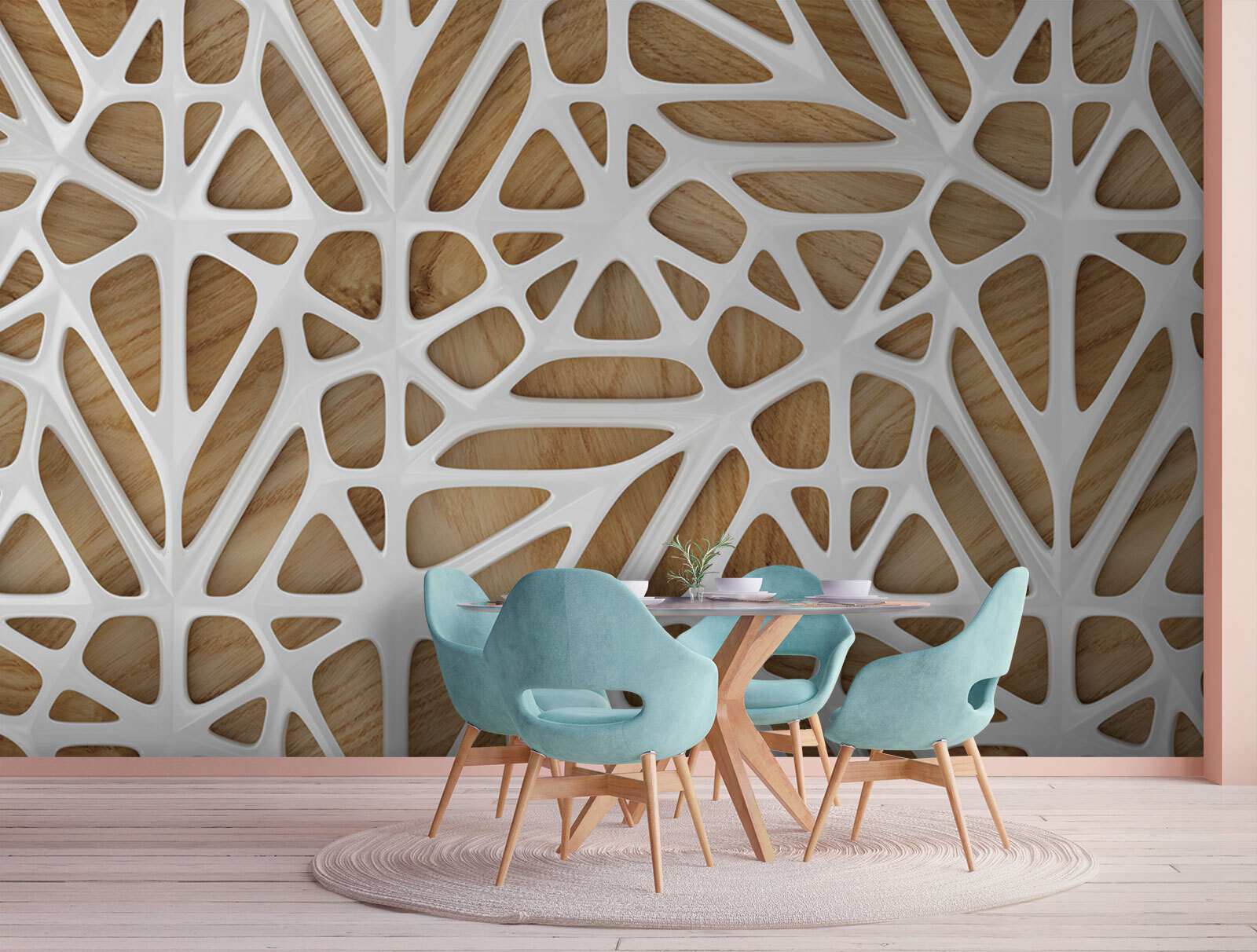 Transform any space with this stunning wall mural featuring an intricate white pattern over warm wood tones. It’s like bringing a piece of nature indoors—where elegance meets a laid-back vibe. Imagine sipping your morning coffee, gazing at the playful play of shapes that seem to dance across the wall. It’s not just decor; it’s a conversation starter, sparking smiles and curious questions from guests. Perfect for a cozy living room or a stylish office, this mural adds character without saying a word. It’s nature-inspired, yet modern—like a gentle hug from the earth itself. And who doesn’t need that?