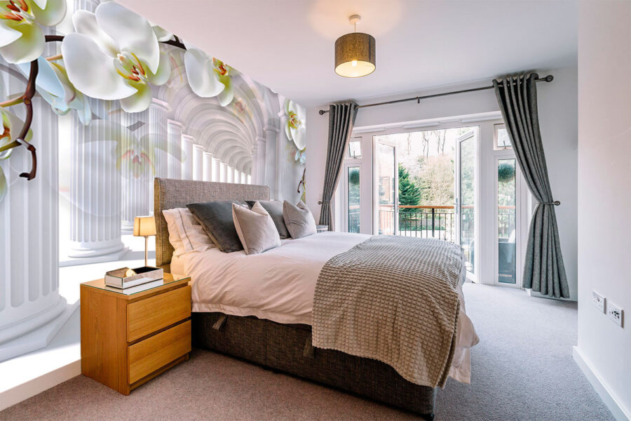 Imagine stepping into a serene corridor where elegance meets nature. This mural, featuring ethereal white orchids cascading along majestic columns, creates a dreamy atmosphere in any space. It’s like bringing a piece of a tranquil garden right into your home. Just picture sipping morning coffee while basking in the light that dances off those delicate flowers—pure bliss! This design effortlessly melds softness with structure, making it perfect for a cozy reading nook or a chic living room. Elevate your walls and let each glance inspire a little daydream. Transform your everyday routine with this unique touch!