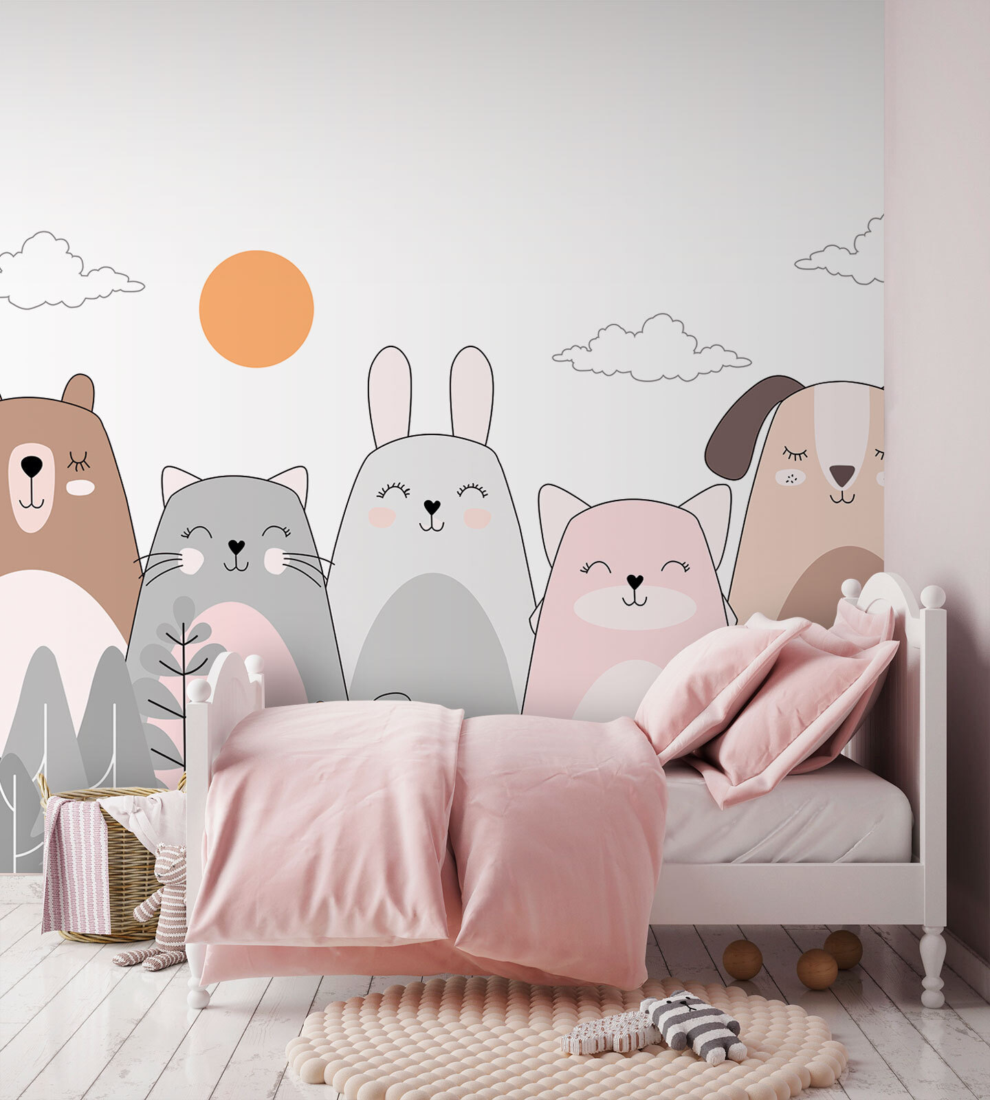 Brighten up your space with “Happy Animals Enjoying the Sun.” This enchanting wall mural features a cheerful bear, a playful cat, a little rabbit, and their furry friends basking in the warm glow of the sun. It’s like having a mini wildlife party in your room! Imagine stepping in and feeling those instant good vibes—who wouldn’t smile back at those adorable faces? Perfect for nurseries, playrooms, or even your cozy reading nook, this mural adds a sprinkle of joy and whimsy to everyday life. Make each moment a little more magical with these furry pals cheering you on!