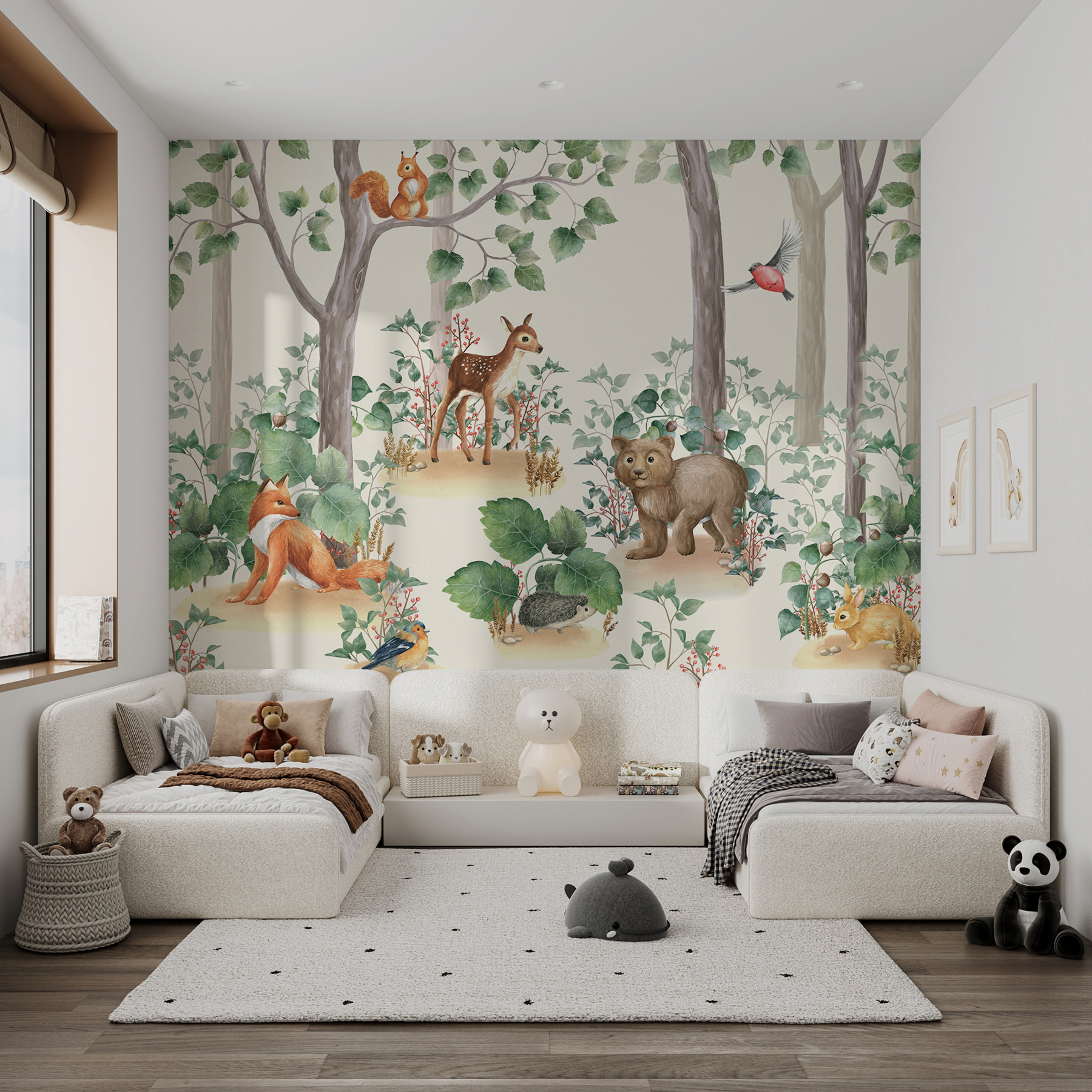 Transform any room into a charming woodland retreat with this delightful mural, “Wall Murals Forest Animals Among the Trees.” Picture it now: a sweet deer nibbling on tender leaves, a cheeky squirrel perched above, and a curious bear peeking from behind the greenery—it’s like a cozy critter convention right on your wall!
