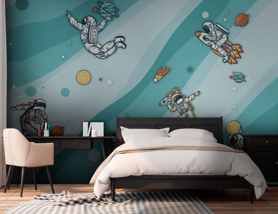 Transform a plain wall into an interstellar playground with this delightful mural featuring a lively group of astronauts floating in space. Every time someone walks by, they’ll feel like they’ve stumbled into a cosmic adventure, complete with colorfully illustrated planets, playful comet trails, and a whole lot of zero-gravity shenanigans. Imagine a child gleefully pointing at the mural, claiming they found a new space buddy, or an adult chuckling at the sight of an astronaut kicking a planet like it’s soccer practice. The soothing watercolor background adds a dreamy vibe, making it perfect for a bedroom, playroom, or even a creative office space. It’s not just decor; it’s a ticket to orbit!