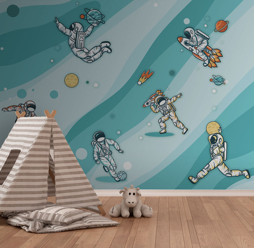 Transform a plain wall into an interstellar playground with this delightful mural featuring a lively group of astronauts floating in space. Every time someone walks by, they’ll feel like they’ve stumbled into a cosmic adventure, complete with colorfully illustrated planets, playful comet trails, and a whole lot of zero-gravity shenanigans. Imagine a child gleefully pointing at the mural, claiming they found a new space buddy, or an adult chuckling at the sight of an astronaut kicking a planet like it’s soccer practice. The soothing watercolor background adds a dreamy vibe, making it perfect for a bedroom, playroom, or even a creative office space. It’s not just decor; it’s a ticket to orbit!