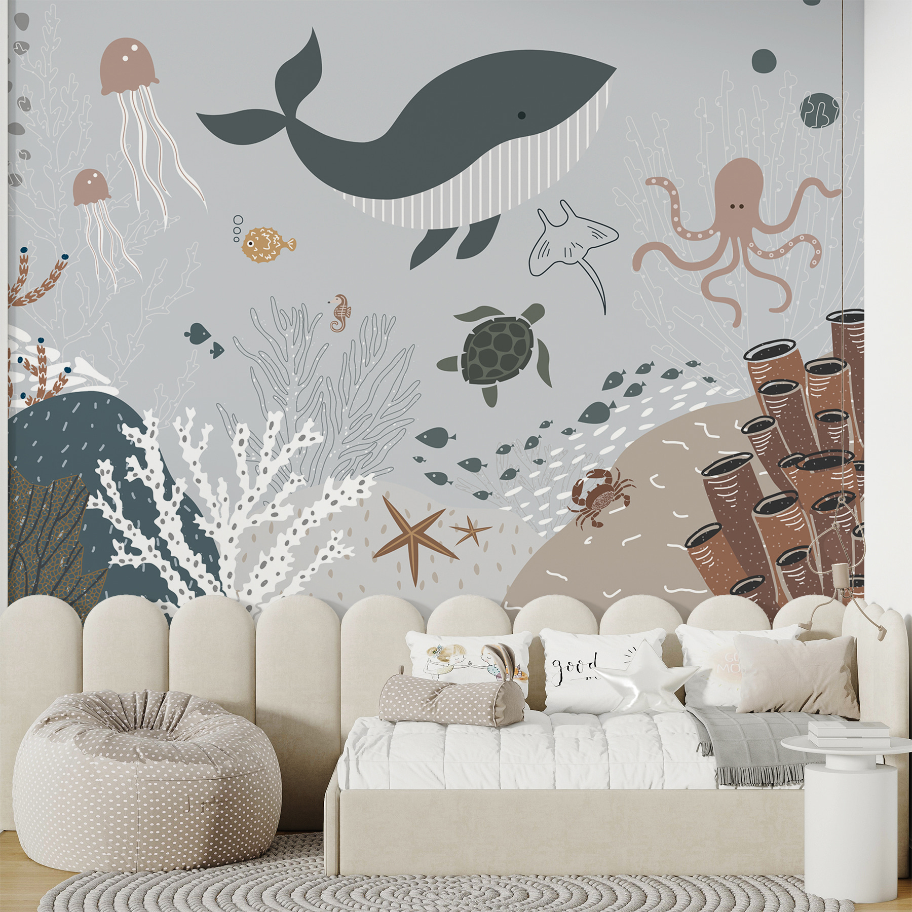 Transform any space with this whimsical “Wall Murals Cartoon of a Whale.” Picture a friendly giant swimming alongside jellyfish and playful turtles, creating an underwater adventure right on your walls. It’s like bringing the ocean’s essence indoors—without the sandy mess! Whether it’s for a kid’s room or a cozy reading nook, this mural sparks creativity and joy. Imagine lounging on your couch while the cheerful whale watches over—how can that not brighten the mood? Plus, it’s a conversation starter for when friends drop by. Dive into a world of wonder!