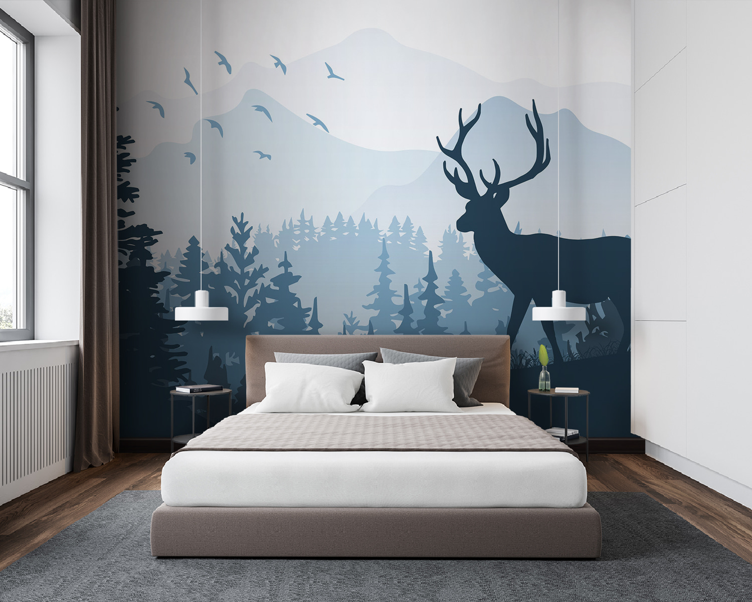 Transform a plain wall into a serene woodland scene with the “Silhouette of a Deer Antlers” mural. Picture it: a majestic deer, silhouetted against distant mountains, roaming through a misty forest. This piece isn’t just decoration—it’s an invitation to daydream and unwind. Imagine the calming effect it brings, like a gentle whisper from nature, making you feel just a bit closer to the great outdoors without stepping outside.