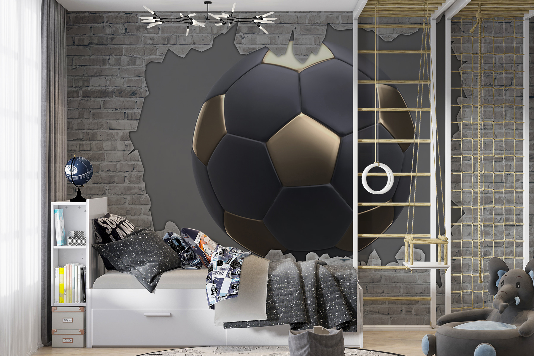 Transform any room with this fun wall mural of a soccer ball bursting through a brick wall. Imagine the excitement on a kid’s face when they see this dynamic design. It’s like the wall has just become their very own stadium! Perfect for playrooms or bedrooms, this mural brings energy and adventure into the mix. With a touch of playful mischief, it encourages young dreamers to kick off their imaginations. A simple way to jazz up a space—just stick it up and watch the magic unfold. Who wouldn’t want a little bit of that lively spirit in their home? It’s all about fun!