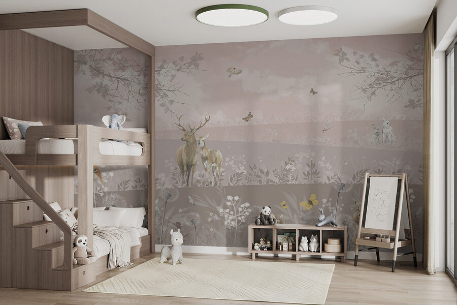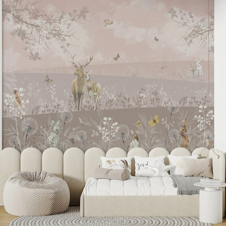 Imagine stepping into a tranquil scene where deer and rabbits frolic under a soft, dreamy sky. This mural, aptly named “Deer and Rabbits in Serene Landscape,” brings nature’s calm right into your home. It’s like having a gentle hug from the outdoors—perfect for a cozy reading nook or a peaceful bedroom vibe. With delicate flowers and fluttering butterflies, it feels almost like a storybook come to life. Just picture those moments sipping tea, or sneaking glances at this lovely mural while daydreaming. It’s not just decor; it’s a little escape every day!