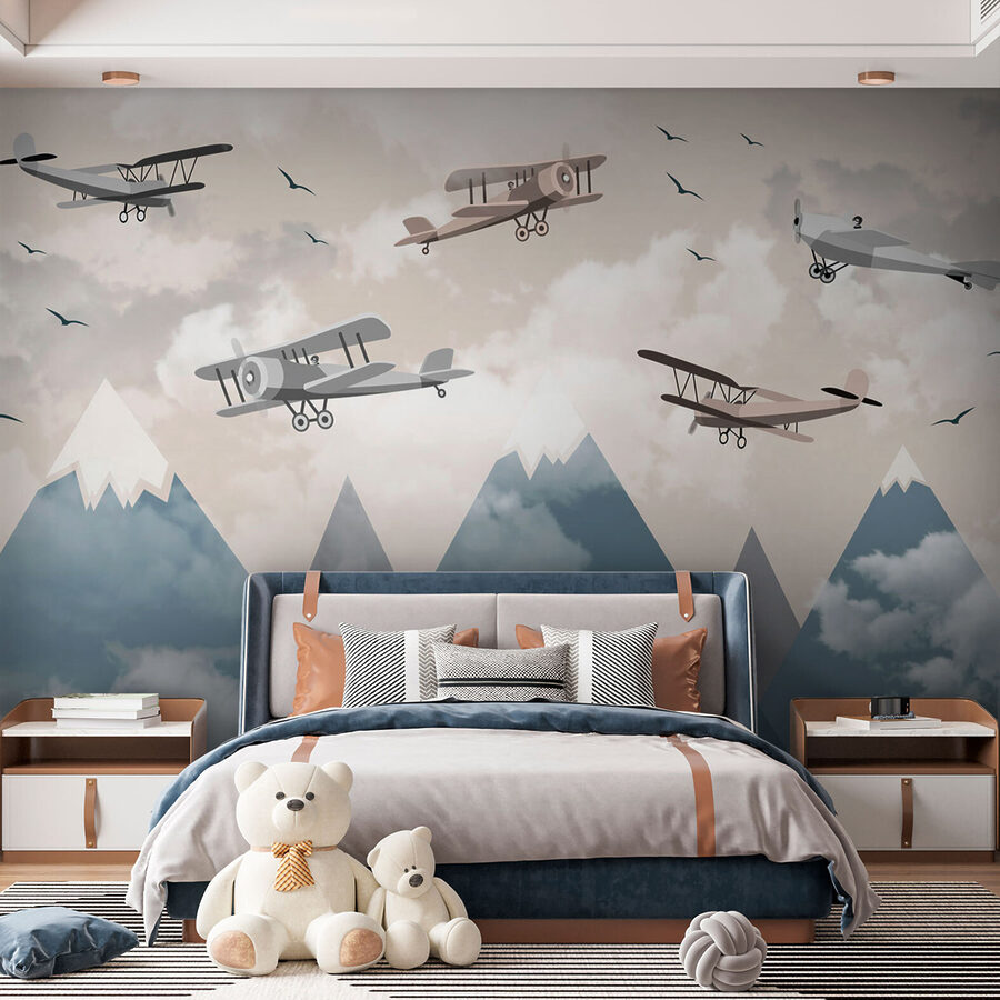 Transform your space into an adventure with “Biplanes Soaring Above Snowy Peaks.” This wall mural is like having a piece of the sky right in your living room. Picture those vintage planes cruising over majestic mountains, surrounded by fluffy clouds and the gentle call of birds. It’s not just decor; it’s an invitation to daydream.