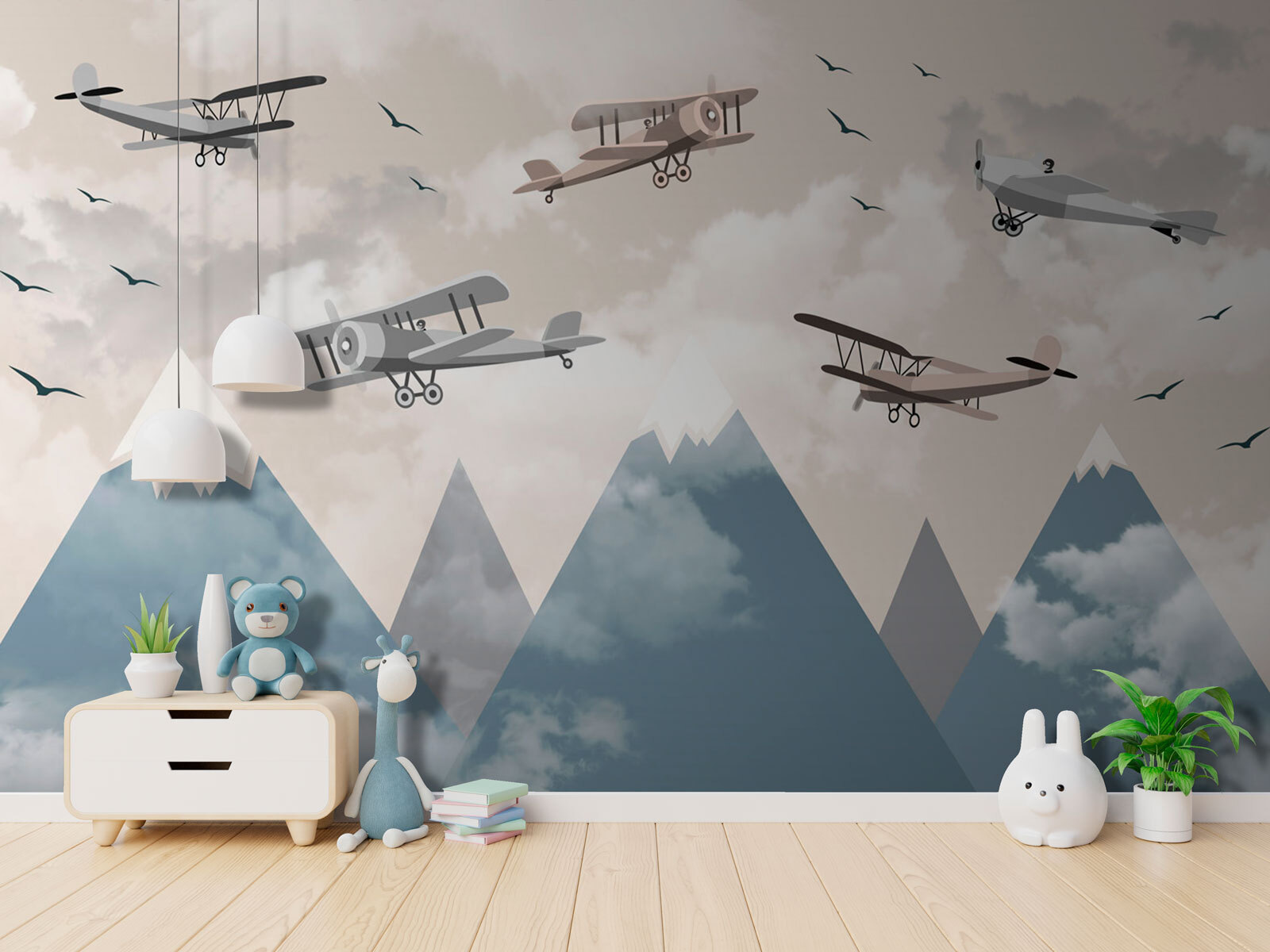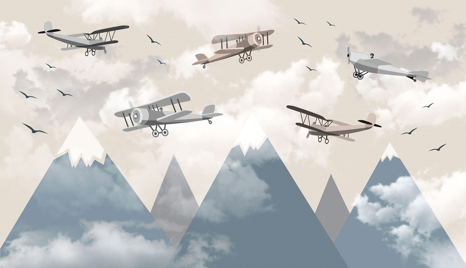 Transform your space into an adventure with “Biplanes Soaring Above Snowy Peaks.” This wall mural is like having a piece of the sky right in your living room. Picture those vintage planes cruising over majestic mountains, surrounded by fluffy clouds and the gentle call of birds. It’s not just decor; it’s an invitation to daydream.