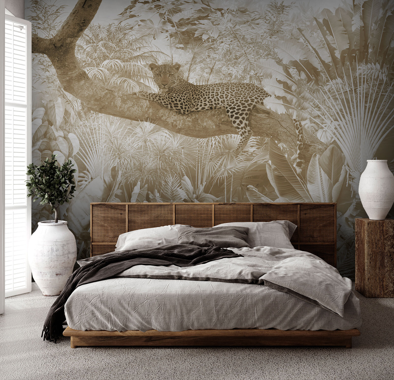 Imagine stepping into a lush jungle every time you glance at your wall. This stunning mural, featuring a leopard lounging high up in the treetops, captures the essence of wild beauty. It’s like having a little piece of nature right in your living room—minus the mosquitoes, thankfully! The intricate details of the foliage wrapped around our feline friend can transport anyone to a tranquil rainforest, inviting daydreams of adventure and escape. Friends will be asking if you’ve taken up a new hobby in wildlife photography. Transform your space into an exotic oasis where relaxation meets inspiration, and let the jungle vibes flow. After all, who wouldn’t want a stylish feline companion keeping watch from the comfort of home?