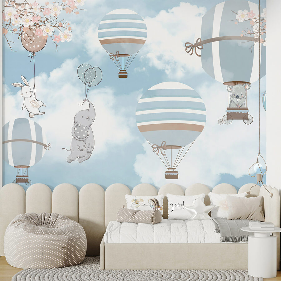 Imagine a whimsical scene where elephants are taking a sky-high adventure in hot air balloons, floating among fluffy clouds. This mural bursts with soft colors and playful designs, turning any room into a dreamscape. Perfect for a nursery or a playful living space, it’s like having a piece of a fairytale right on your wall.