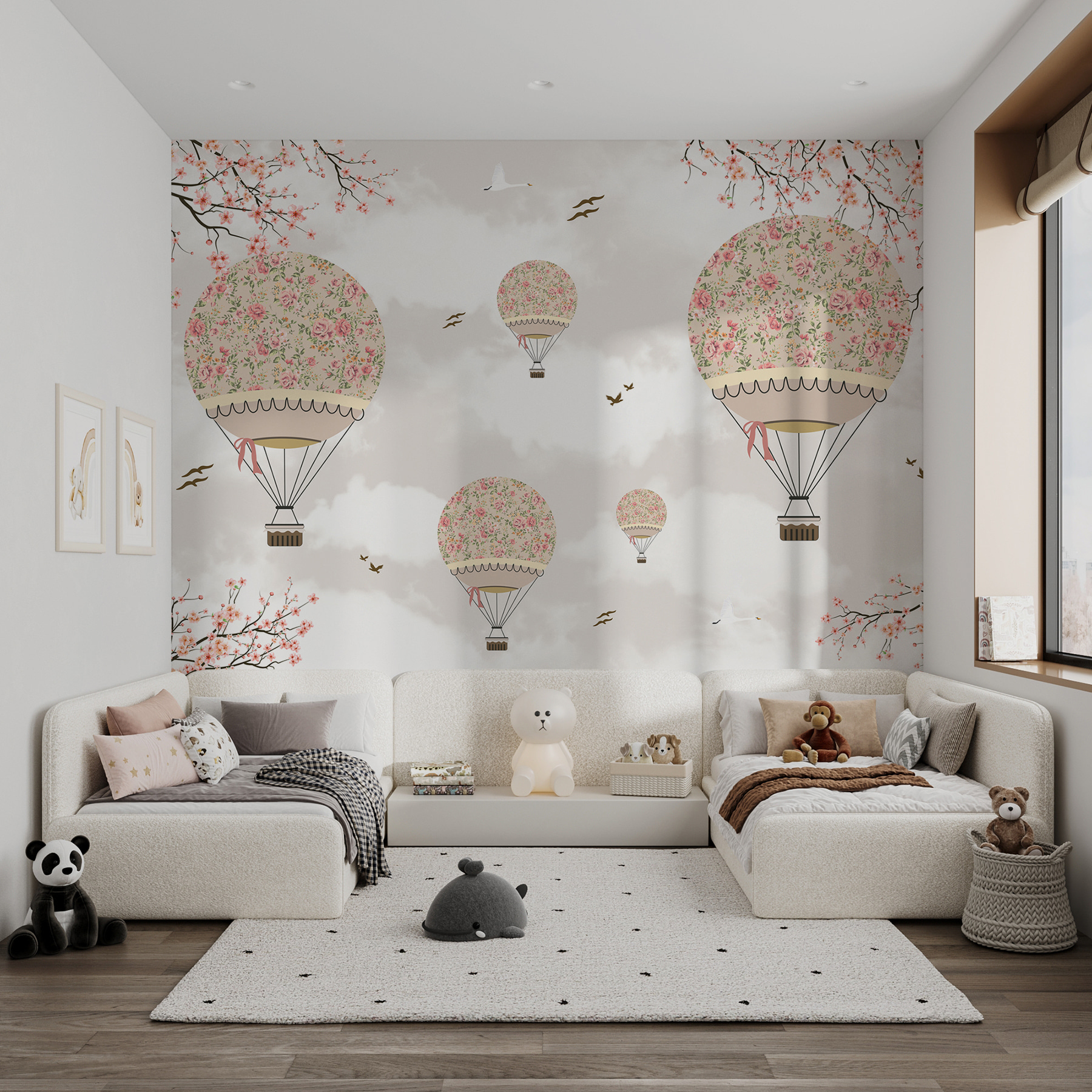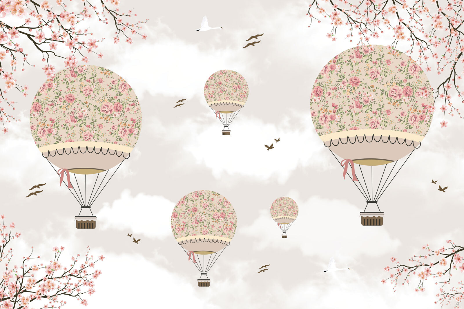 Transform any room into a whimsical escape with this enchanting wall mural featuring hot air balloons, adorned with delicate flowers. Imagine waking up to this charming scene—balloons floating gently against a soft backdrop of clouds and branches bursting with blossoms. It’s like a little piece of magic has landed right on your wall! Perfect for those cozy corners or a joyful nursery, it brings an airy touch and a hint of adventure. Who wouldn’t want to soar through a field of flowers? Just make sure to keep your feet on the ground—no balloon rides needed to enjoy this beauty!