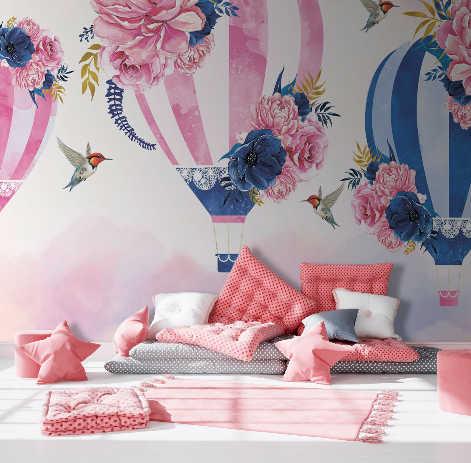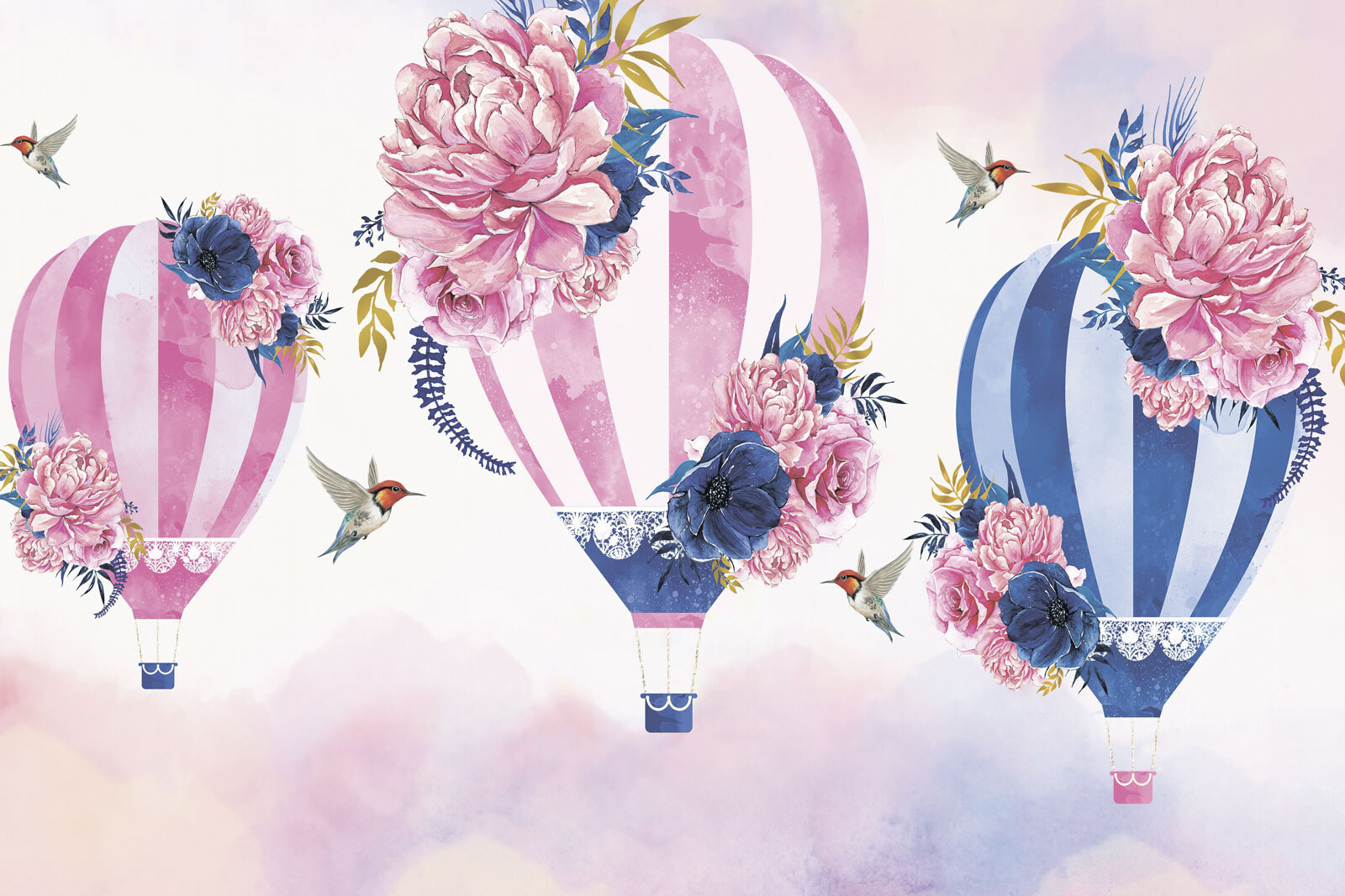 Transform your space with this dreamy mural featuring a group of hot air balloons adorned with beautiful flowers. Imagine stepping into a room that feels like it’s floating on a gentle breeze, where each balloon brings a pop of color and whimsy. The soft hues and delicate blooms create a serene vibe, perfect for a cozy reading nook or a cheerful kid’s room. Plus, those little hummingbirds? Adorable! It’s like nature and art had a lovely chat, and you get to enjoy the masterpiece. Who wouldn’t feel a bit lighter just looking at it? Perfect for those who believe that a pinch of magic can live in every corner of your home!