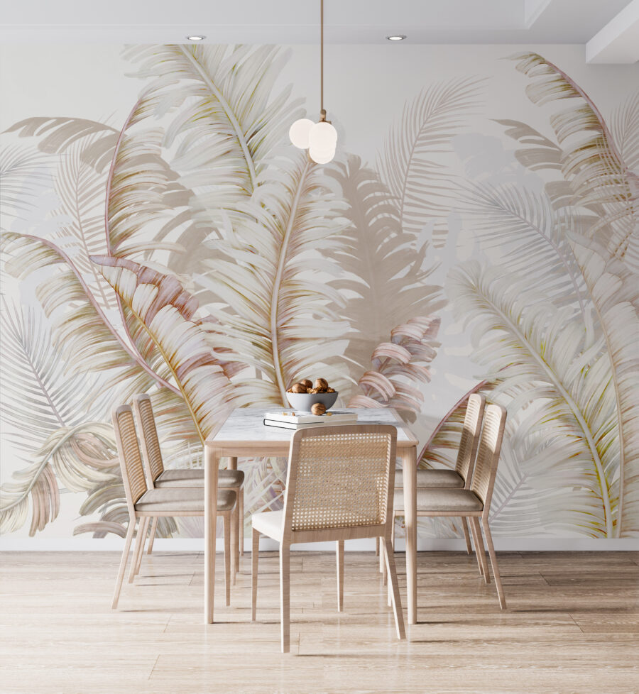 Transform a plain wall into a tropical paradise with the “Tropical Leaves in Gentle Hues” mural. Imagine walking into a space that feels like a serene escape, surrounded by soft, calming colors and delicate leaf patterns. It’s like having a tiny jungle right in your living room, minus the mosquitoes, of course! This mural adds that perfect touch of nature—ideal for creating a chill vibe in any room. Just picture sipping your morning coffee, basking in that tropical glow. Who wouldn’t feel relaxed with this beauty as a backdrop? Perfect for those craving a bit of serenity or a splash of style!