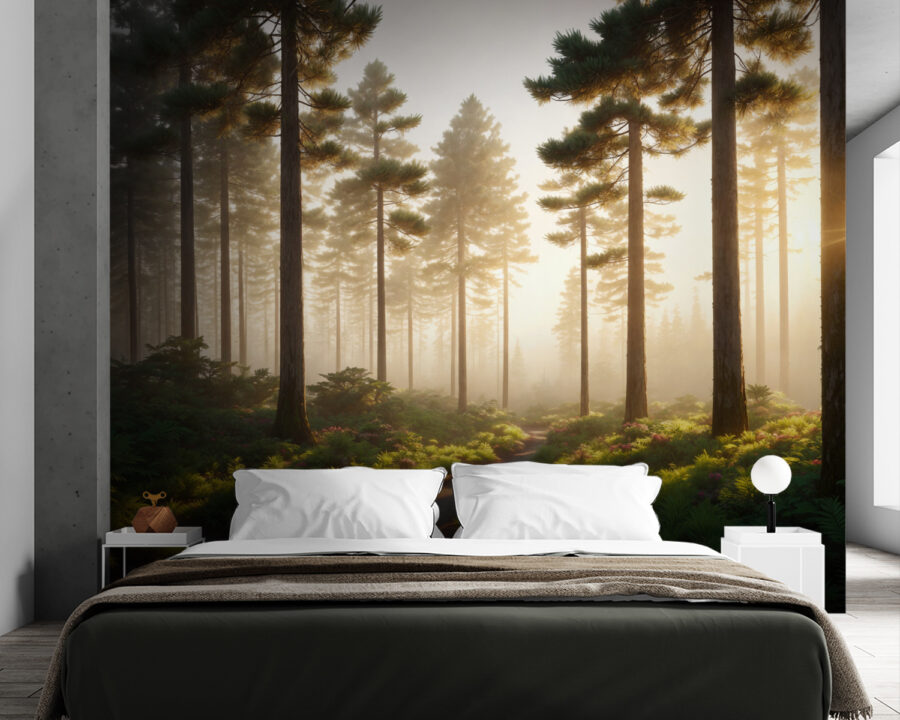 Wall murals Sunrise over tranquil forest path. (SKU: u94526)