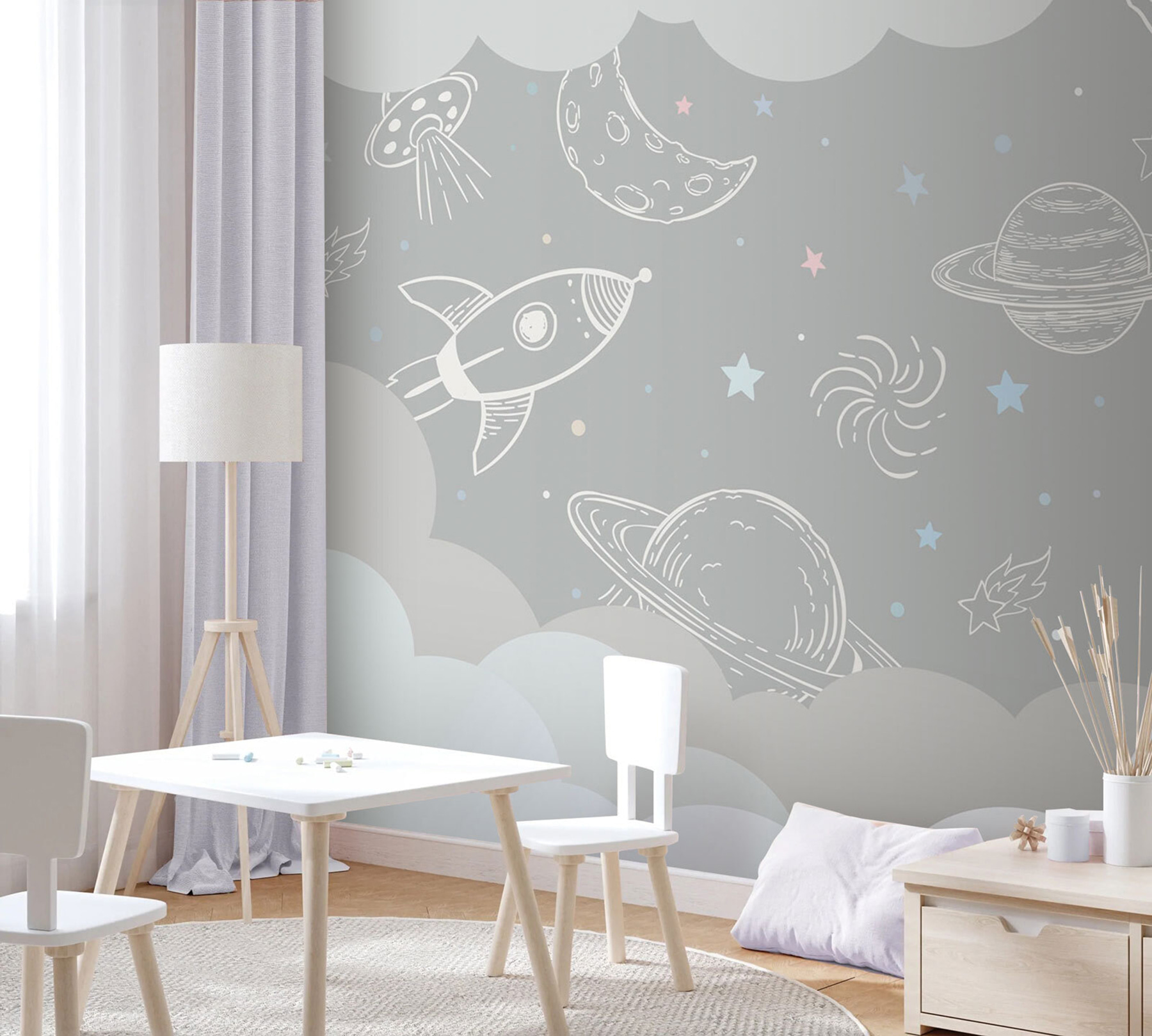 Transform any space into a whimsical escape with this charming wall mural, showcasing a playful design of rockets, stars, and planets against a soft grey backdrop. It’s like stepping into a cozy spaceship, ready for intergalactic adventures. Imagine a kiddo drifting off to sleep, dreaming of space travel, or maybe you just want a daily reminder to reach for the stars—literally! The gentle colors create a serene vibe, making it perfect for bedrooms or playrooms. Plus, it hides scuffs and marks better than you might think. Who wouldn’t want to feel a little more cosmic every day?