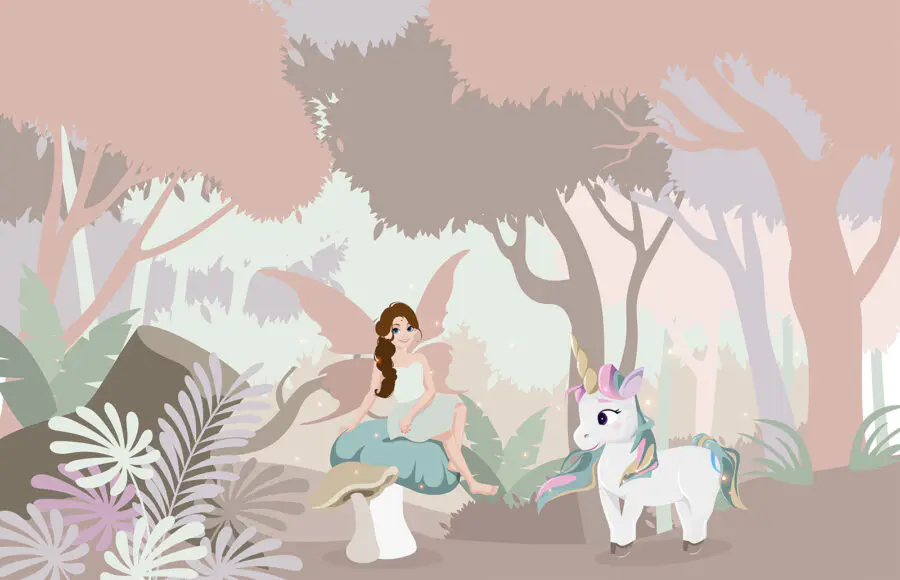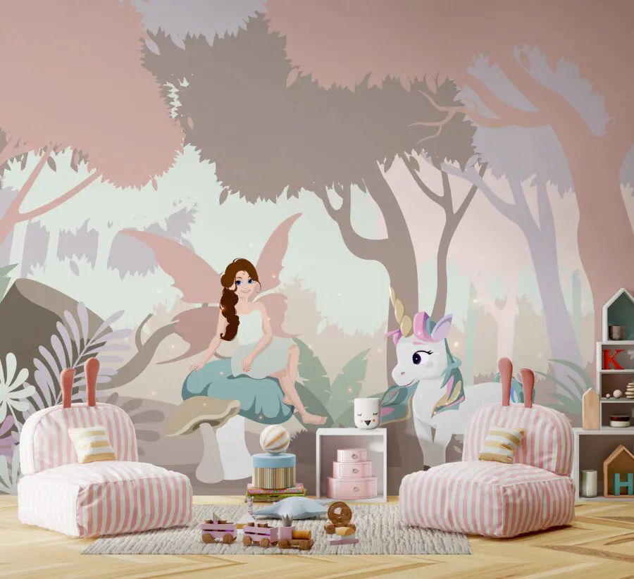 Transform any space into a whimsical getaway with this delightful wall mural featuring a serene unicorn and a charming fairy. Imagine walking into a room where magic and nature collide—because who doesn’t want a sprinkle of enchantment in their life? The soft pastel hues create a calming backdrop, perfect for snuggling up with a good book or daydreaming.