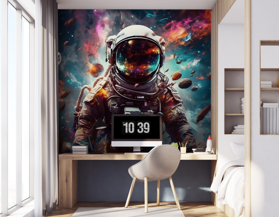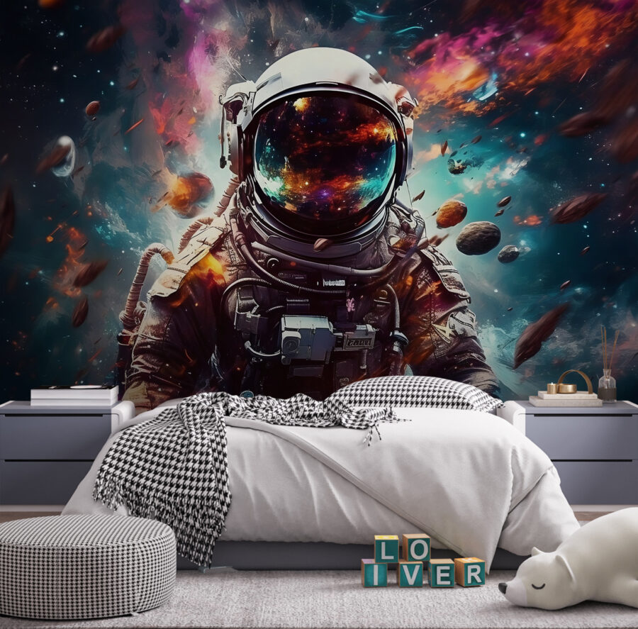 Drift into another world with this stunning mural, “Astronaut Floating Amidst Cosmic Debris.” Imagine a cozy room, the walls come alive with swirling galaxies and vibrant bursts of color, a perfect backdrop for daydreaming or introspection.