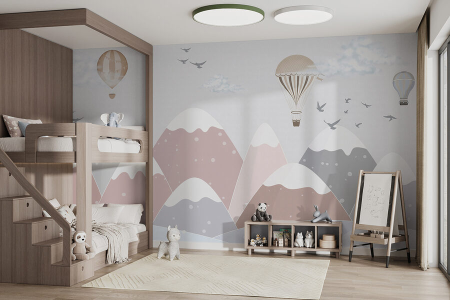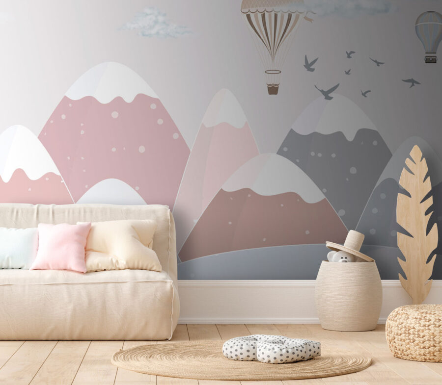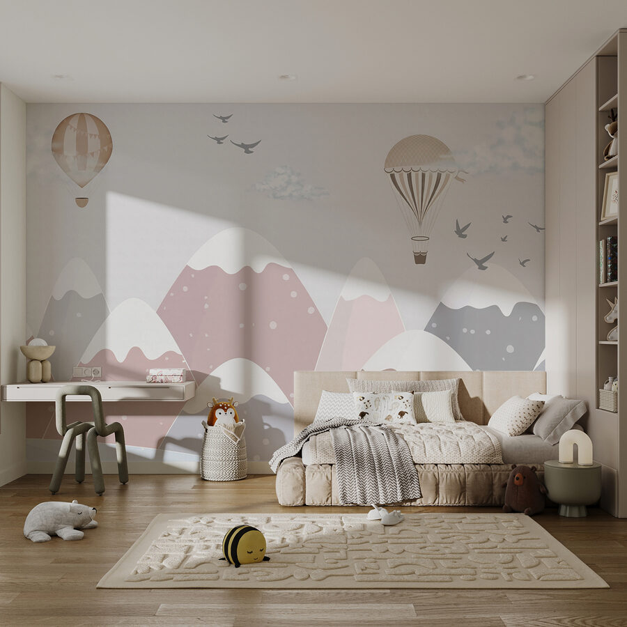 Imagine stepping into a cozy space where hot air balloons drift lazily above snowy mountains—sounds dreamy, right? This mural, “Balloons Soar Above Snowy Mountains,” captures that whimsy perfectly. The soft pastel colors create a calm vibe, inviting thoughts of winter adventures and warm mugs filled with cocoa. Picture a sunny afternoon, lounging with friends, and your eyes wander to those enchanting landscapes. The mountains seem to whisper stories of far-off places. Plus, the lighthearted balloons? They add a playful touch, making any room feel just a bit more magical. Perfect for a chill hangout spot or even a kid’s room! Who wouldn’t want to escape to such a serene scene?