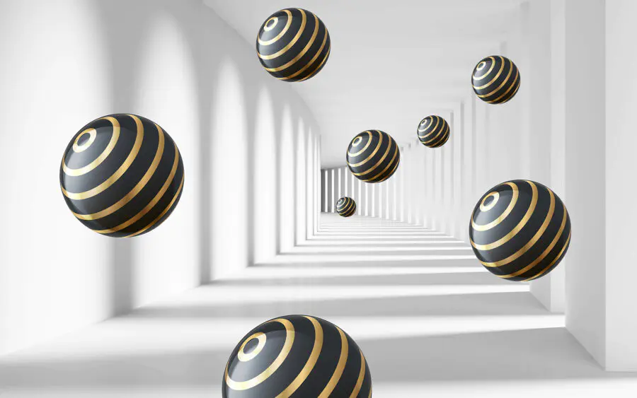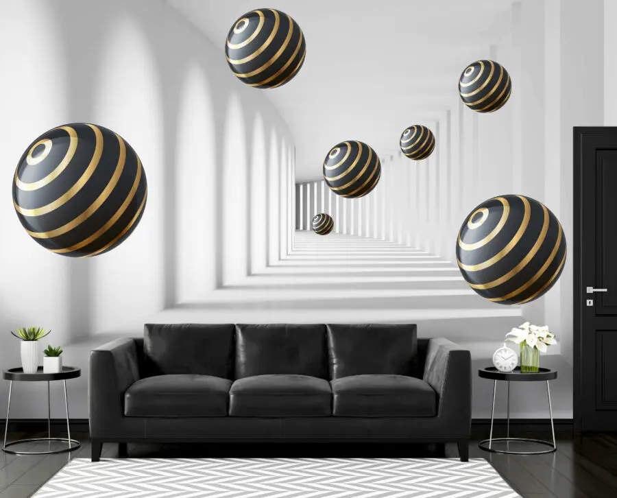 Step into a world where striped spheres float gracefully in a gleaming white corridor. This wall mural isn’t just decor; it’s an invitation to a space where imagination roams free. Picture this: on a lazy Sunday, sitting back with a cup of coffee, gazing at these mesmerizing orbs as they seem to dance in mid-air. It’s like a scene from a dream and who wouldn’t want a touch of whimsy in their home? Ideal for a modern vibe, this mural can transform any dull wall into a visual playground—perfect for sparking creativity in a cozy nook or energizing a lackluster hallway. Enjoy the play of light and shadow, and let these delightful spheres add a sprinkle of charm to everyday life.