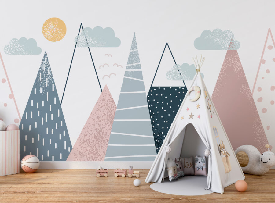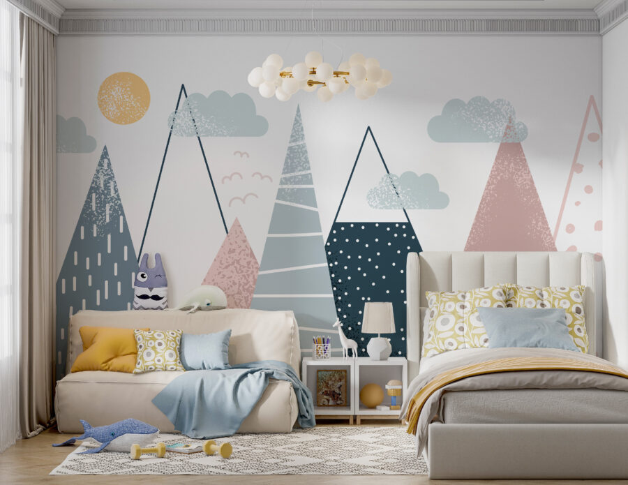 Transform any space with the playful charm of this wall mural featuring geometric mountains under a sunlit sky. Imagine a child’s room filled with the lively colors and patterns, sparking their imagination every time they glance up. Those soft hues and unique shapes create a cozy vibe, perfect for dreaming or storytime. It’s like inviting a little bit of nature inside, where every mountain seems to whisper fun adventures. Plus, the playful clouds add a touch of whimsy, making this mural a delightful backdrop for all sorts of creativity. Time to make those walls come alive!