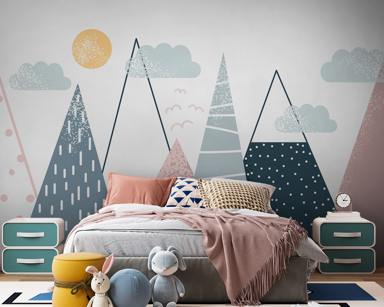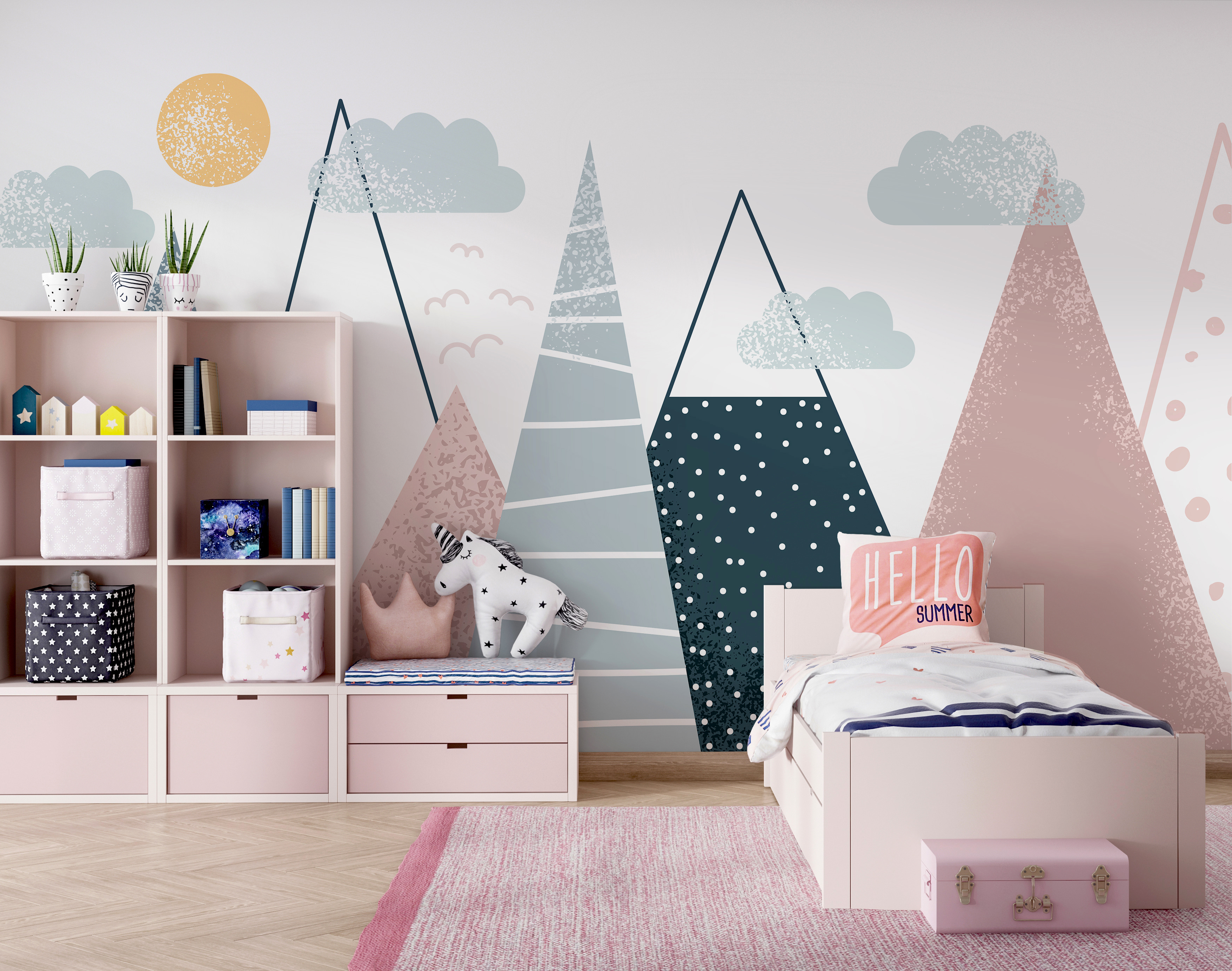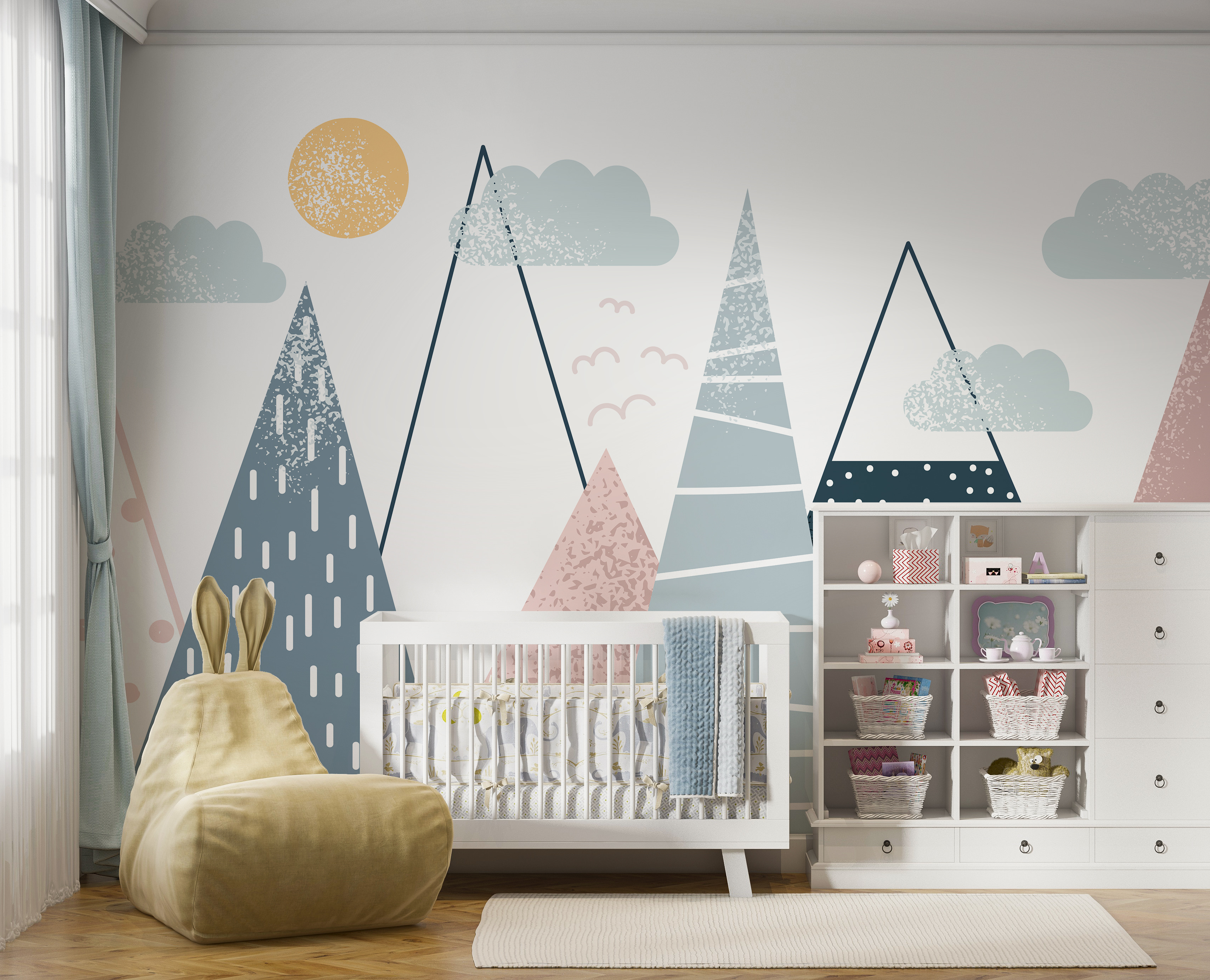 Transform any space with the playful charm of this wall mural featuring geometric mountains under a sunlit sky. Imagine a child’s room filled with the lively colors and patterns, sparking their imagination every time they glance up. Those soft hues and unique shapes create a cozy vibe, perfect for dreaming or storytime. It’s like inviting a little bit of nature inside, where every mountain seems to whisper fun adventures. Plus, the playful clouds add a touch of whimsy, making this mural a delightful backdrop for all sorts of creativity. Time to make those walls come alive!