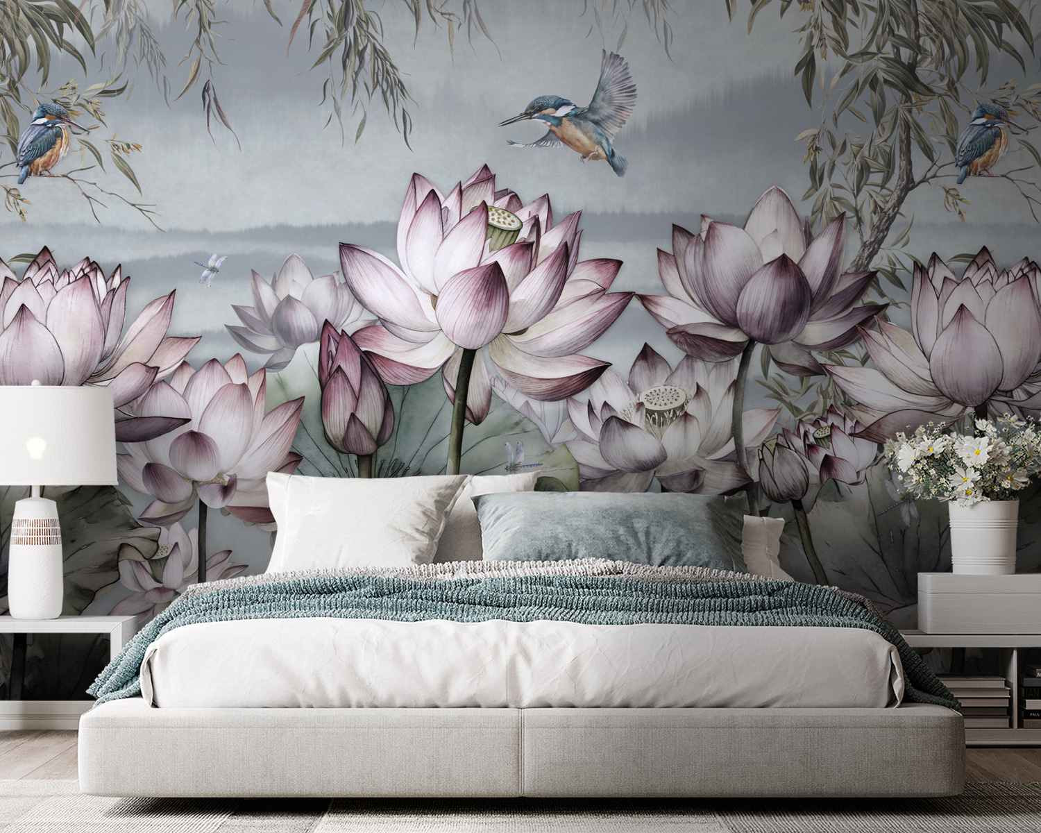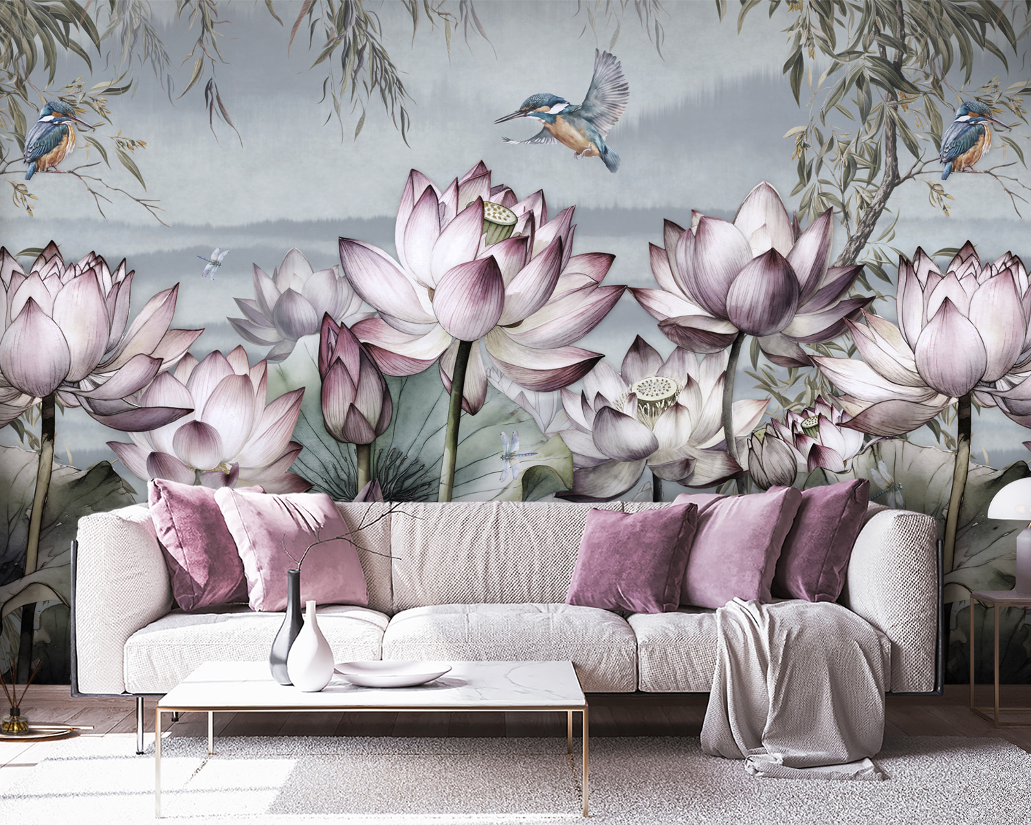 Transform a dull wall into a serene escape with this stunning mural featuring birds gliding over delicate lotus blossoms. Imagine kicking back in your cozy nook, sipping tea while colorful birds flit around a tranquil scene, making every moment feel like a mini getaway. This mural isn’t just decor; it’s like inviting a piece of nature indoors. Friends might even mistake it for a window, and well, who wouldn’t want to play interior designer? A splash of color, a hint of whimsy—perfect for bringing some joy into everyday life. It’s not just a wall; it’s a vibe!
