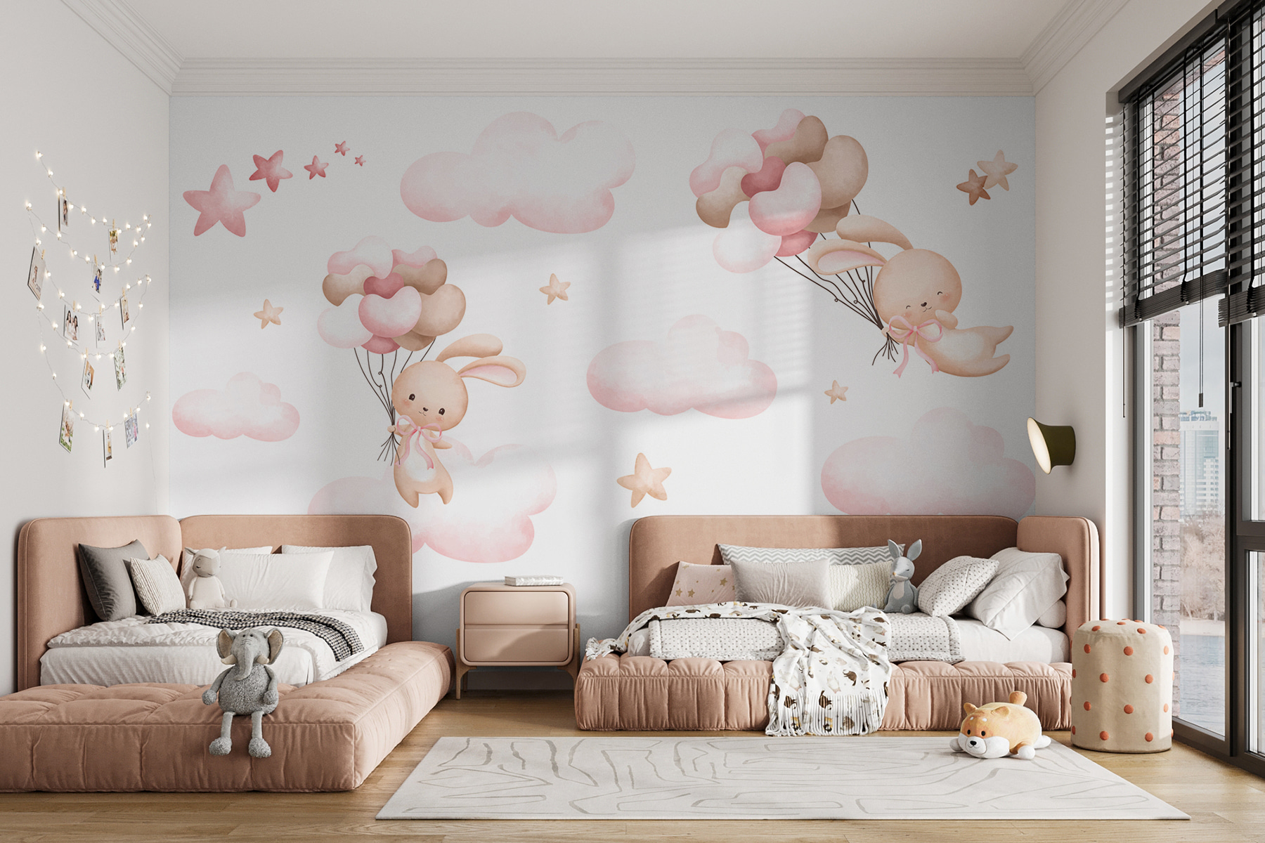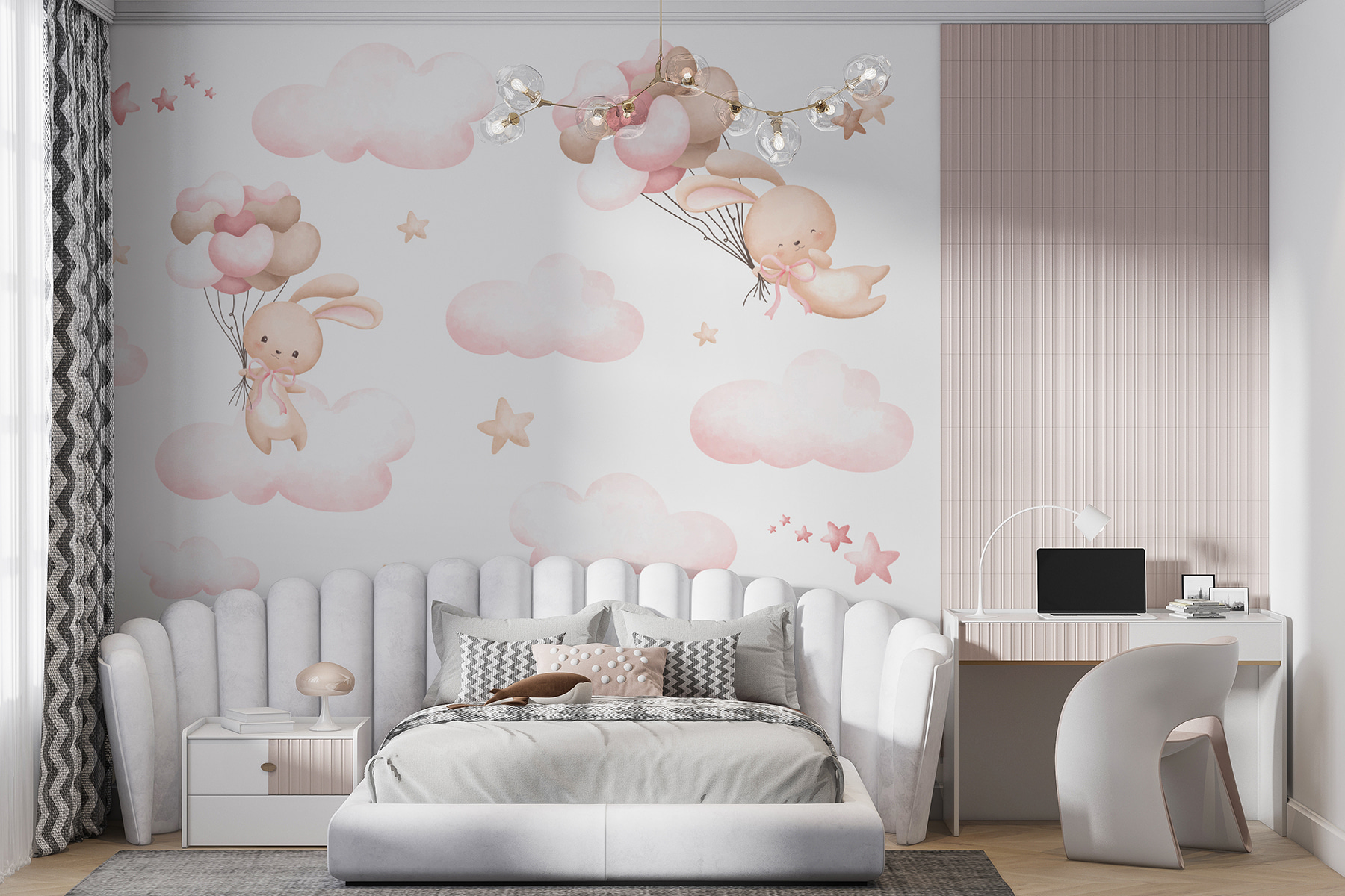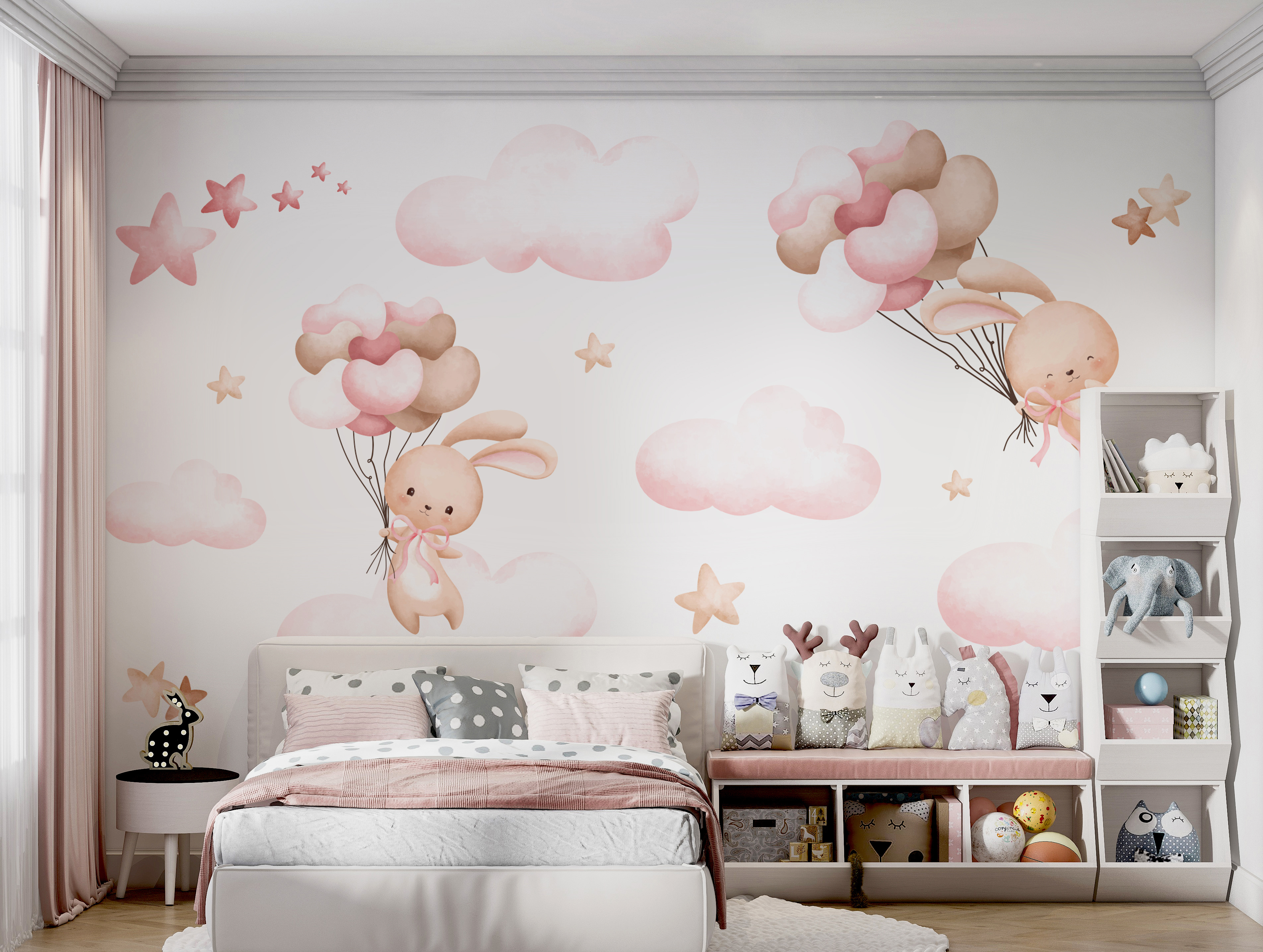 Transform any child’s space into a dreamy haven with this adorable mural featuring playful bunnies floating among fluffy clouds and whimsical stars. Imagine the looks of joy when little ones see their new secret adventure world right on their wall! The soft colors create a calming vibe, perfect for winding down after a busy day of play. It’s like inviting a little bit of magic into the room, with each glance sparking imagination and sparking stories of fluffy clouds and balloon rides. It’s not just decor; it’s an everyday adventure waiting to happen!