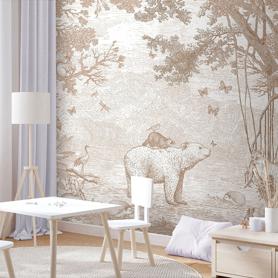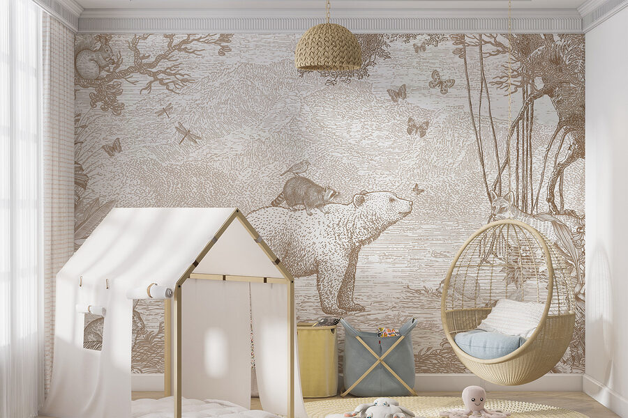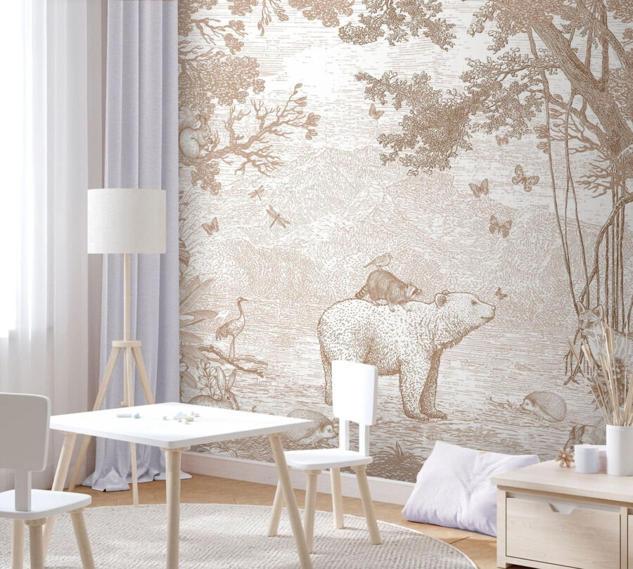 Transform your space with the whimsical charm of this “Raccoon on Top of a Bear” mural. Imagine a cozy room where a raccoon, seemingly lost in thought, rides atop a gentle bear, surrounded by playful critters and soft butterflies. It’s like a storybook scene that invites you to step into a woodland adventure every time you glance at it. This mural effortlessly blends nature and a touch of fantasy, making it a perfect conversation starter. Whether it brightens up a child’s room or adds a quirky twist to a living area, it’s sure to spark joy and a few smiles. Who wouldn’t feel a little lighter with this delightful duo hanging around? Embrace the magic!