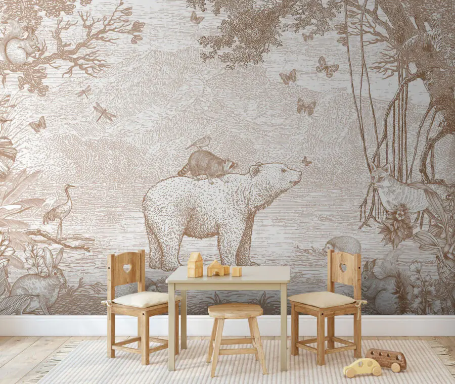 Transform your space with the whimsical charm of this “Raccoon on Top of a Bear” mural. Imagine a cozy room where a raccoon, seemingly lost in thought, rides atop a gentle bear, surrounded by playful critters and soft butterflies. It’s like a storybook scene that invites you to step into a woodland adventure every time you glance at it. This mural effortlessly blends nature and a touch of fantasy, making it a perfect conversation starter. Whether it brightens up a child’s room or adds a quirky twist to a living area, it’s sure to spark joy and a few smiles. Who wouldn’t feel a little lighter with this delightful duo hanging around? Embrace the magic!