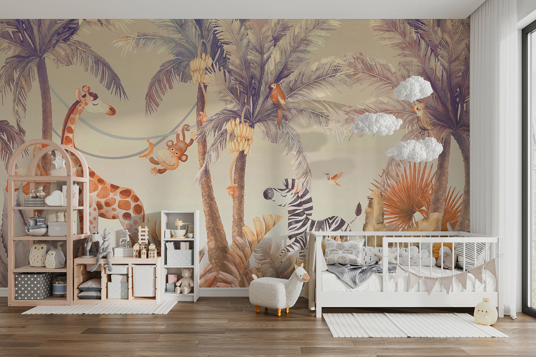Imagine a cheerful jungle scene that’ll make every kiddo feel like they just stepped into a sunlit adventure. This mural captures playful animals lounging under swaying palms, with a giraffe happily keeping company with a mischievous monkey. It’s like they’re all in on a secret, just waiting for a friend to join their sunny escapade. Every glance at this mural brings a smile, turning walls into a playground of imagination. Whether it’s for a daughter’s dreamy retreat or a son’s fun hideout, this mural brings charm and joy—perfect for brightening up any space!