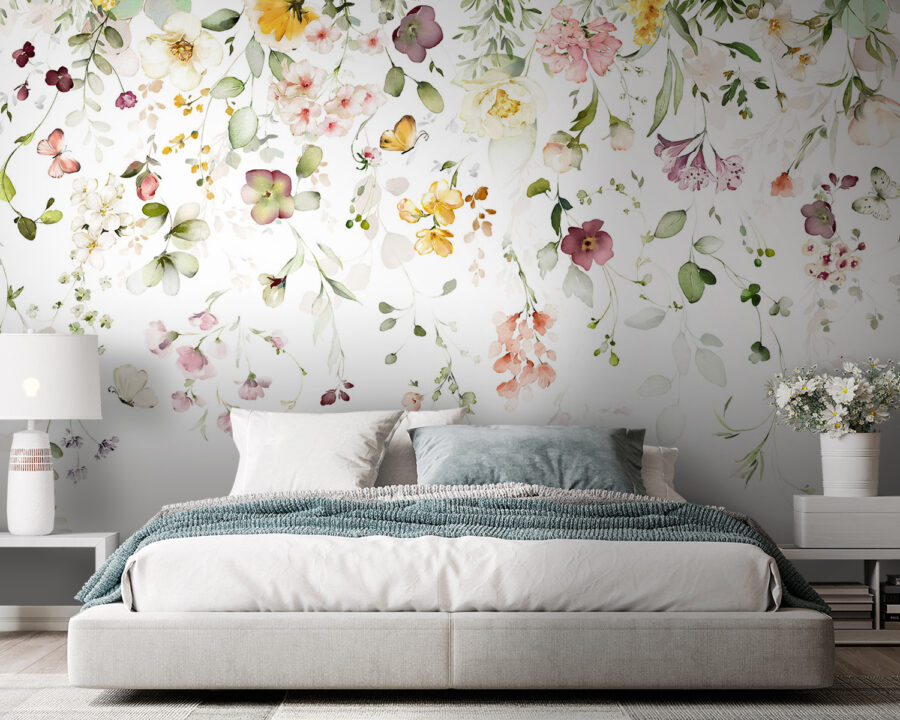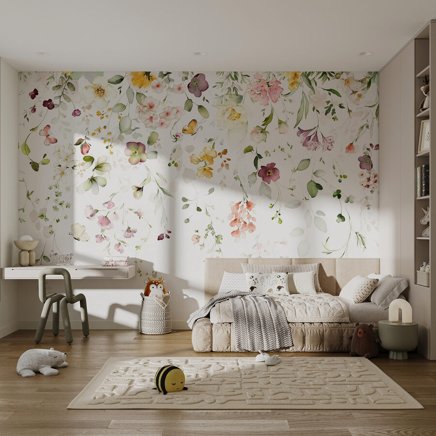 Transform your space into a serene garden with this stunning mural featuring delicate watercolor flowers. Imagine waking up to a burst of soft blooms that feel like a gentle hug. This design brings a touch of nature indoors, wrapping your walls in a cascade of colors that dance across the surface. Picture yourself sipping your morning coffee, surrounded by floating petals and leafy tendrils, feeling instantly uplifted. It’s more than just wall art—it’s a vibe. Perfect for a cozy nook or a dreamy bedroom, this mural will whisper elegance into your everyday life. Who wouldn’t want that?