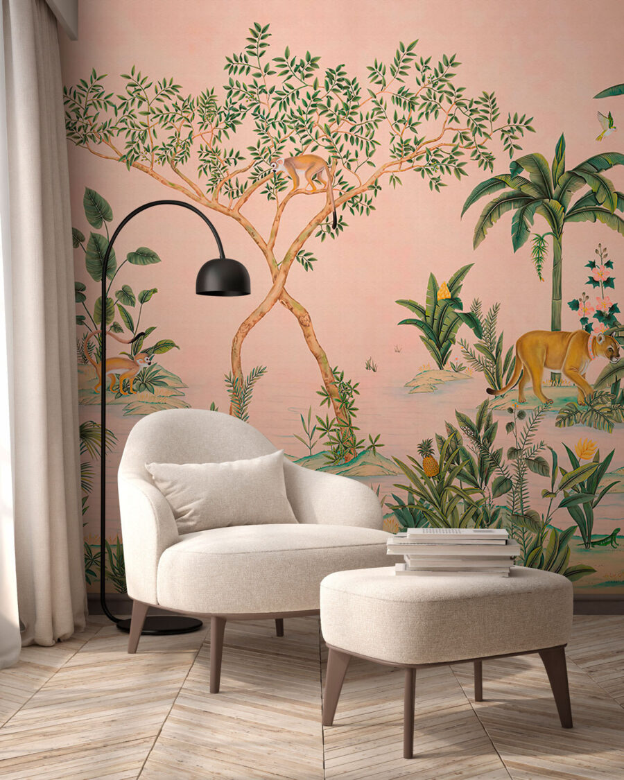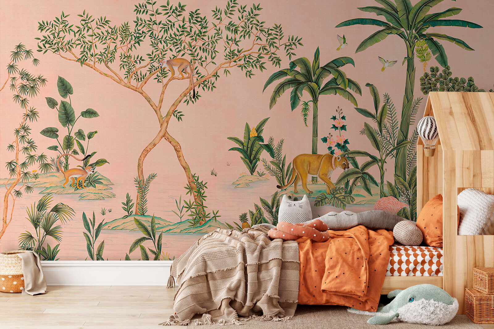 Transform your space with this vibrant wall mural featuring a playful dog amidst a lush, enchanting landscape. It’s not just a decoration—it’s like inviting a piece of nature into your home. Imagine waking up to this burst of color and whimsy every morning. The lively greens and soft pink backdrop create a warm, inviting atmosphere. Friends will stroll in and pause, caught in a daydream of tropical vibes and joyful pups. Perfect for a cozy living room or a fun playroom, this mural adds that unique flair that says, “Yes, life is an adventure!” Embrace the charm and let this delightful scene spark conversations and smiles.