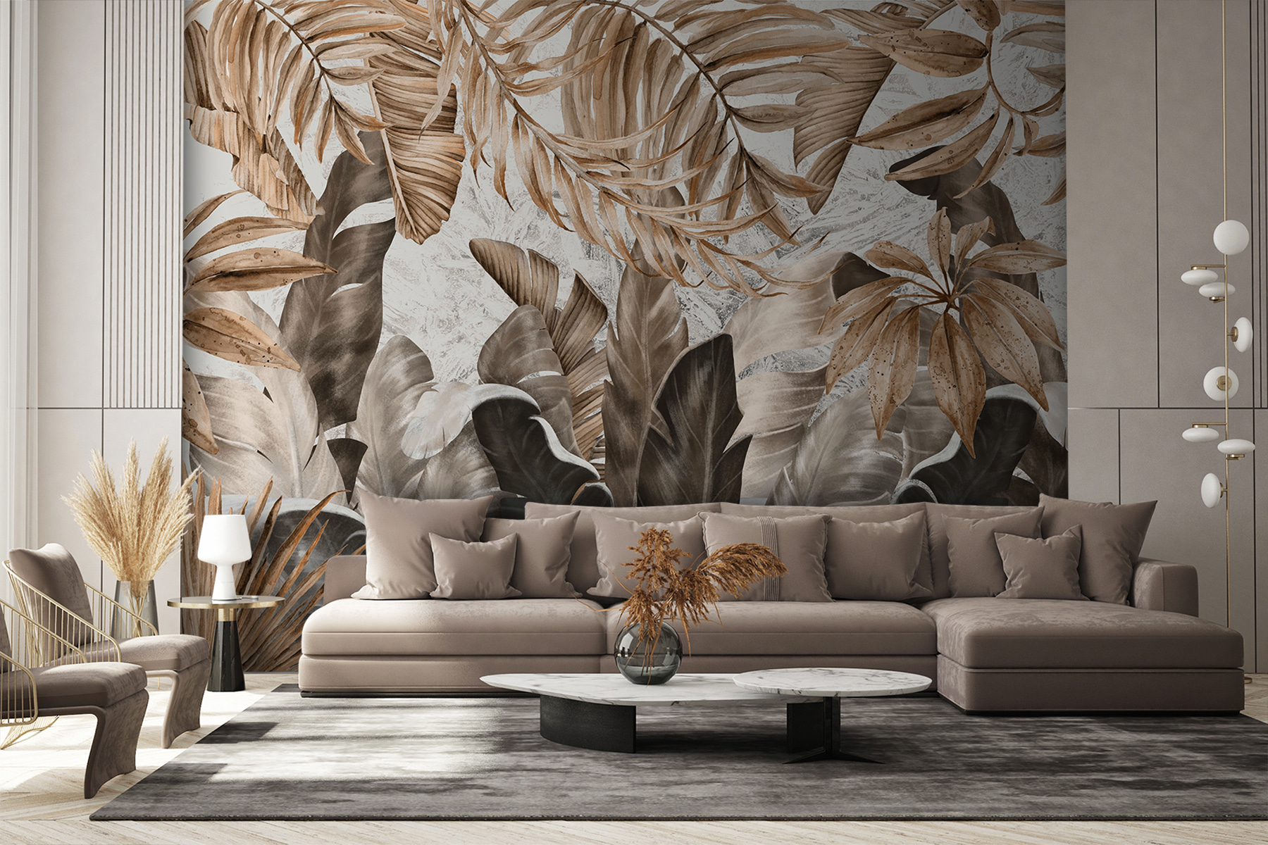 Transform a plain wall into a lush escape with this stunning mural of tropical leaves in earthy tones. Imagine stepping into a serene oasis every time you walk by—these beautifully illustrated leaves bring a cozy, natural vibe right into your space. Perfect for a living room or home office, it’s like having a green thumb without any of the watering. And let’s be real, who has time for that? Friends will marvel at your style, wondering how you created such an inviting atmosphere. Just be prepared for a few comments about how they need to up their decor game!