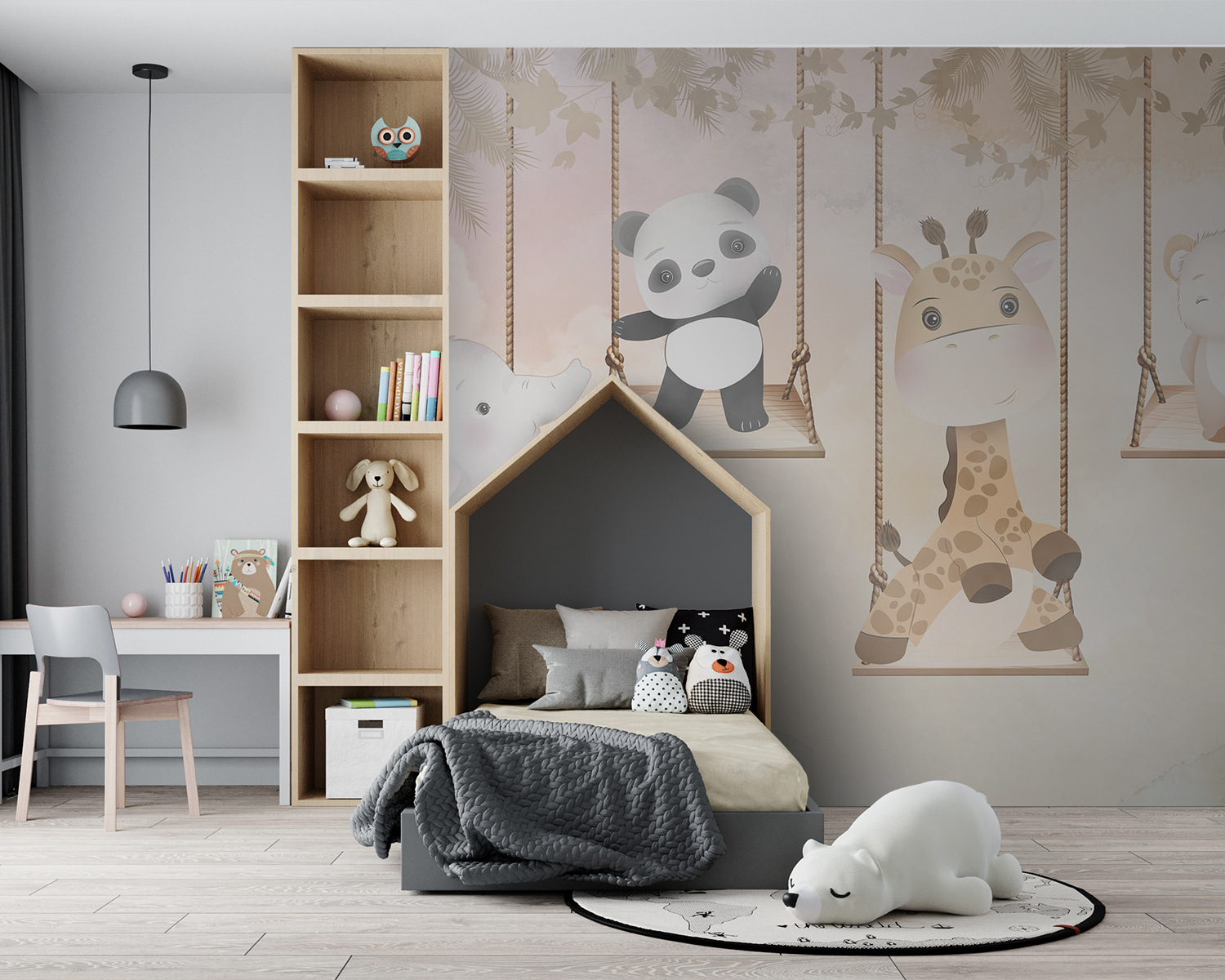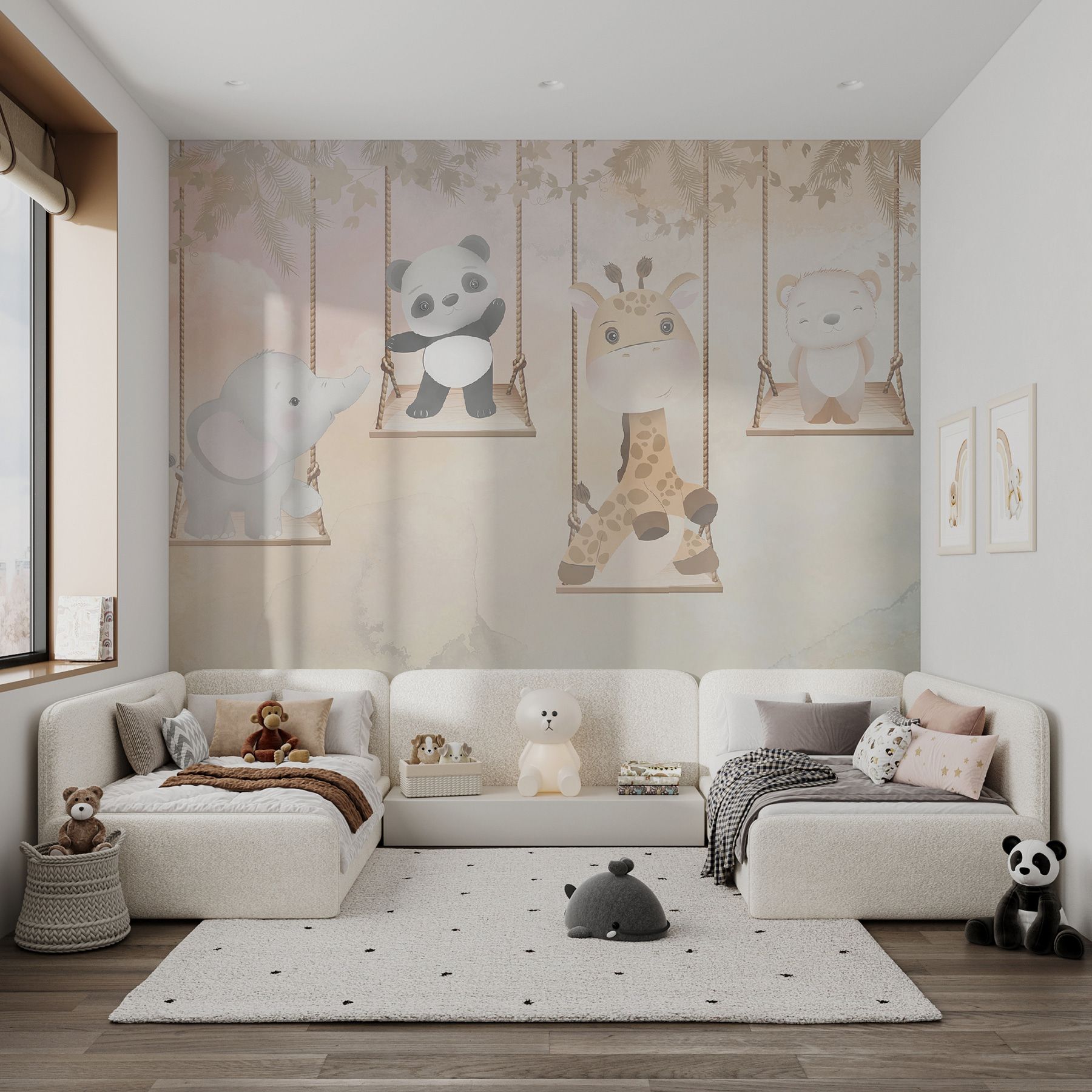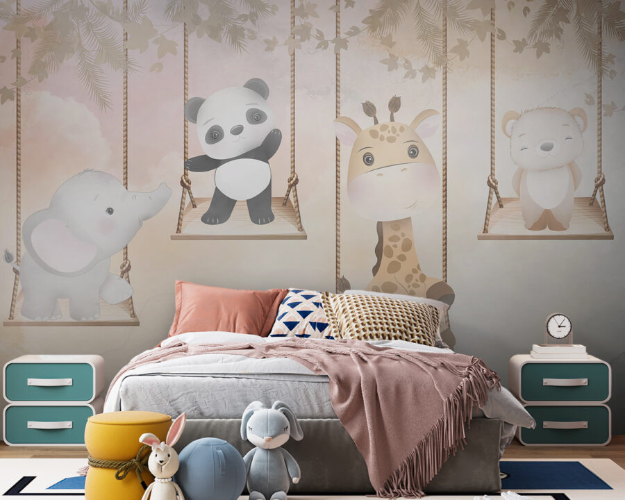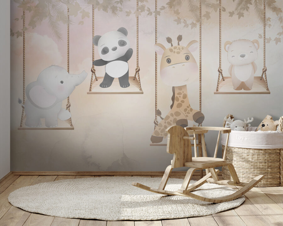 Brighten up any room with this charming mural featuring playful critters swinging in the breeze! Picture a giraffe, elephant, panda, and bear happily lounging on their swings, surrounded by soft pastel colors. It’s like a little slice of jungle magic, perfect for nurseries or playrooms. Imagine the smiles this mural will bring—little ones will adore it, and adults might even find themselves giggling at the critters’ carefree antics. It’s a whimsical invitation to daydream and play, making every glance a mini adventure. Who wouldn’t want to swing along with these adorable friends?