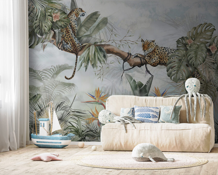 Transform your space with the vibrant charm of this leopard skin mural. Picture this: bold leopards lounging among lush tropical leaves, creating a jungle paradise right in your living room. It’s like an escape to a sunny jungle without the humidity! Kids will love the playful vibe, and it might just spark a few adventures in their imaginations. The soft colors blend seamlessly, almost whispering a calm “relax, you’ve arrived.” Ideal for curious little ones or anyone wanting to add a splash of wild elegance to their walls, this mural brings a touch of nature’s beauty indoors.