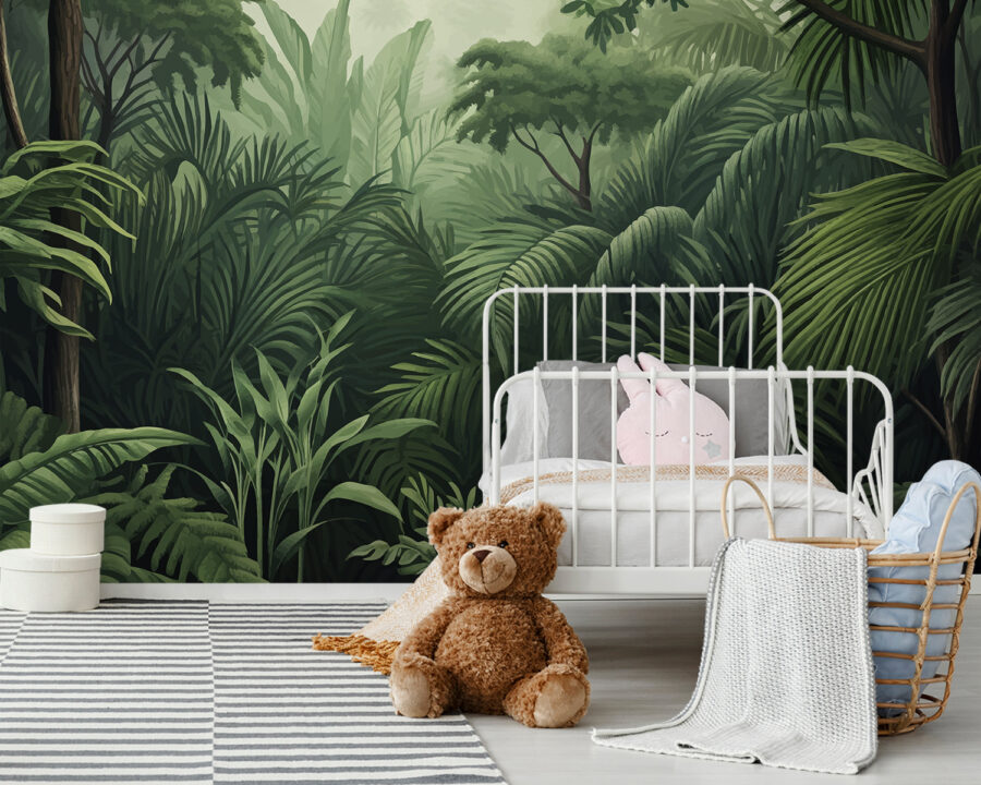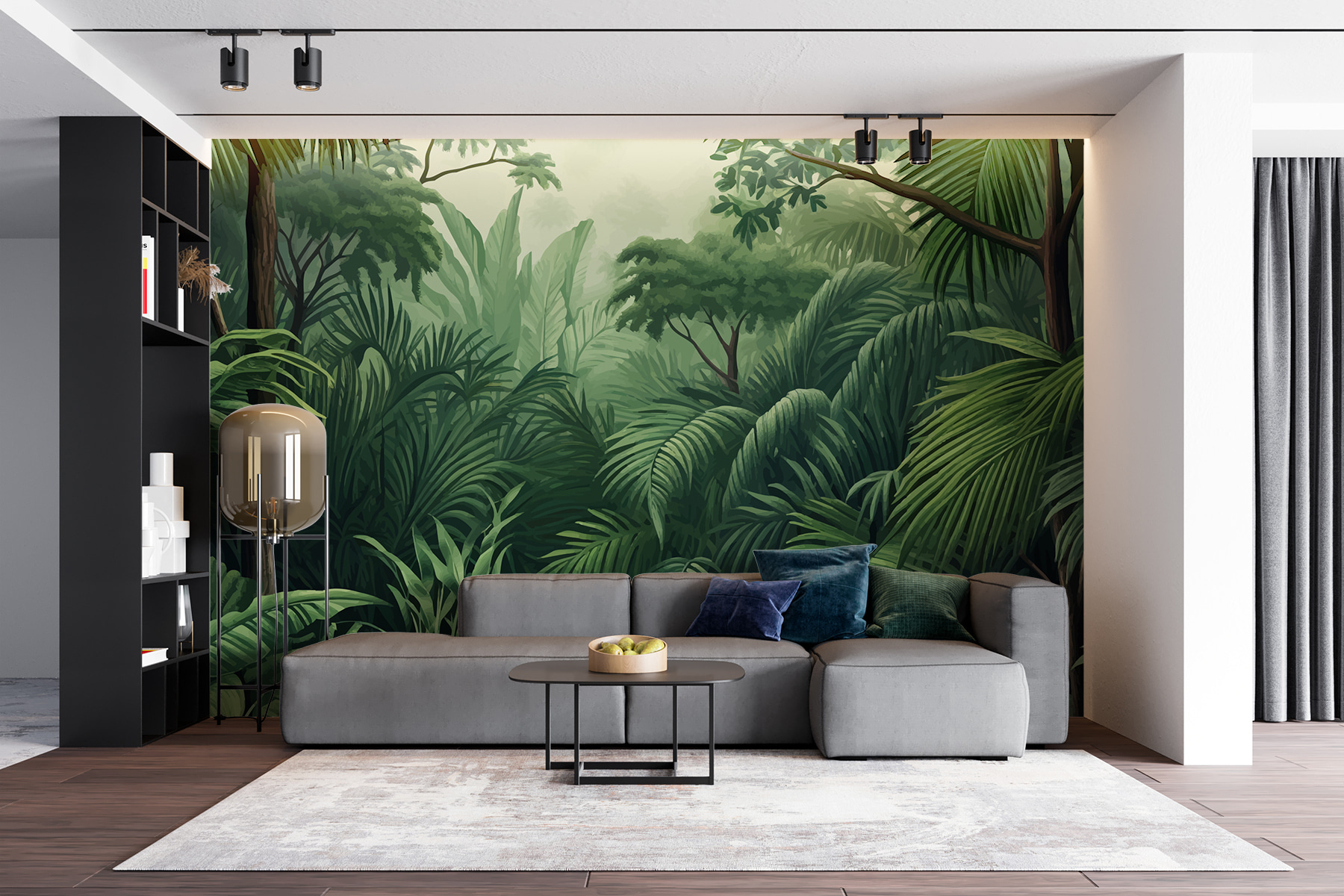 Each leaf feels like it’s inviting you to explore, maybe even daydream about sipping a tropical drink surrounded by sights and sounds of nature. Friends will walk in, do a double-take, and wonder if they’ve just arrived at a fancy resort. And the best part? No bugs! Just pure, green goodness. This mural is more than just decor; it’s an invitation to breathe deeply and embrace a little wildness in everyday life.