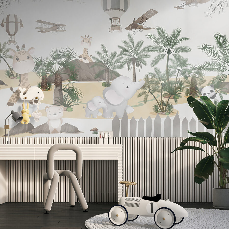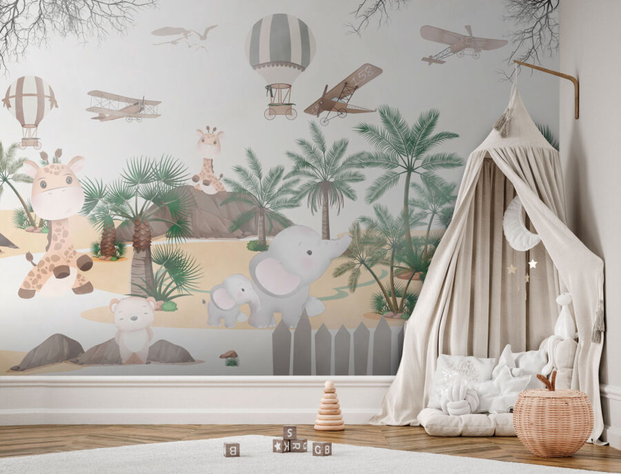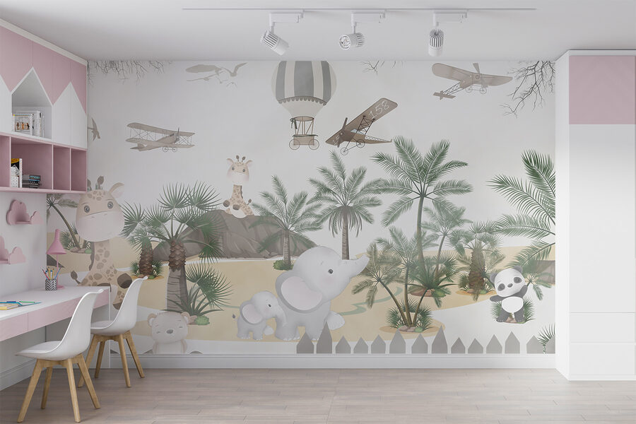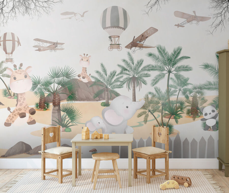 Transform any room into a whimsical escape with this charming wall mural featuring a delightful giraffe amid swaying palm trees. It’s like bringing a slice of the savanna right into your living room—without the humidity! Picture it: kids giggling as they spot the friendly elephant and curious panda peeking out, and how could anyone resist that giraffe’s adorably oversized cheeks? This mural adds a touch of adventure and imagination, making it perfect for playrooms or nurseries. The colors are soft and soothing, creating a relaxed vibe, while the playful characters spark joy and wonder. So, if you’re dreaming of a space that feels fun yet cozy, this mural is a fantastic pick. Who wouldn’t smile every time they walked by?