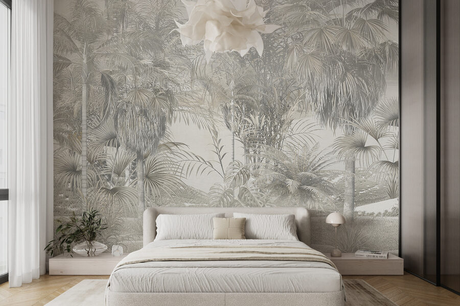 Transform your space with the soothing vibes of “Tropical Trees in Misty Landscape.” Imagine walking into a room embraced by gentle palms and the soft allure of a serene, misty ambiance. This mural isn’t just a wall covering—it’s like bringing a slice of the tropics indoors. It whispers of lazy mornings with coffee in hand, surrounded by nature’s calming beauty.