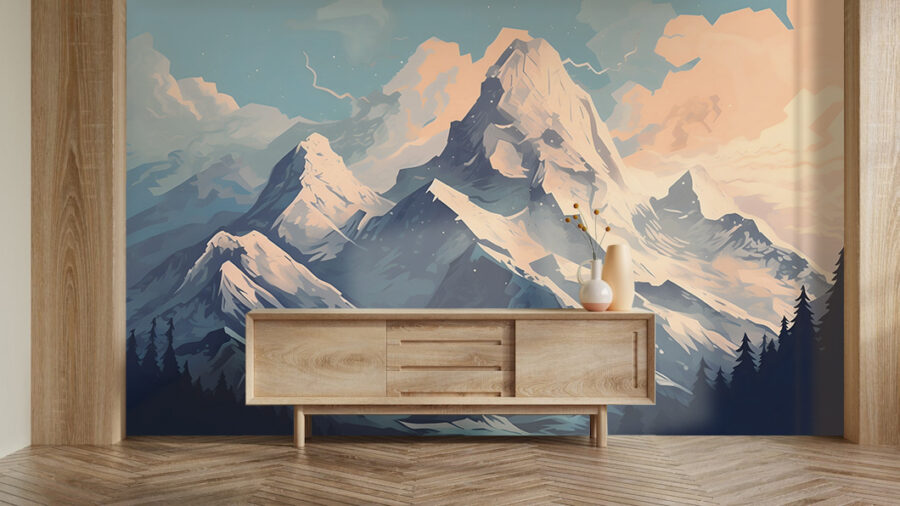 Transform any room into a serene getaway with this stunning wall mural featuring snow-capped mountains kissing the sky. Imagine waking up to this breathtaking scene every day—it’s like bringing a slice of nature indoors. The soft colors and dramatic peaks create a calm vibe, perfect for a cozy reading nook or a tranquil bedroom. Plus, let’s face it, nothing says “I’m sophisticated yet laid-back” like mountain views, right? It’s more than just decor; it’s an invitation to daydream about adventures while sipping coffee at home. Embrace the beauty and let your walls do the talking!