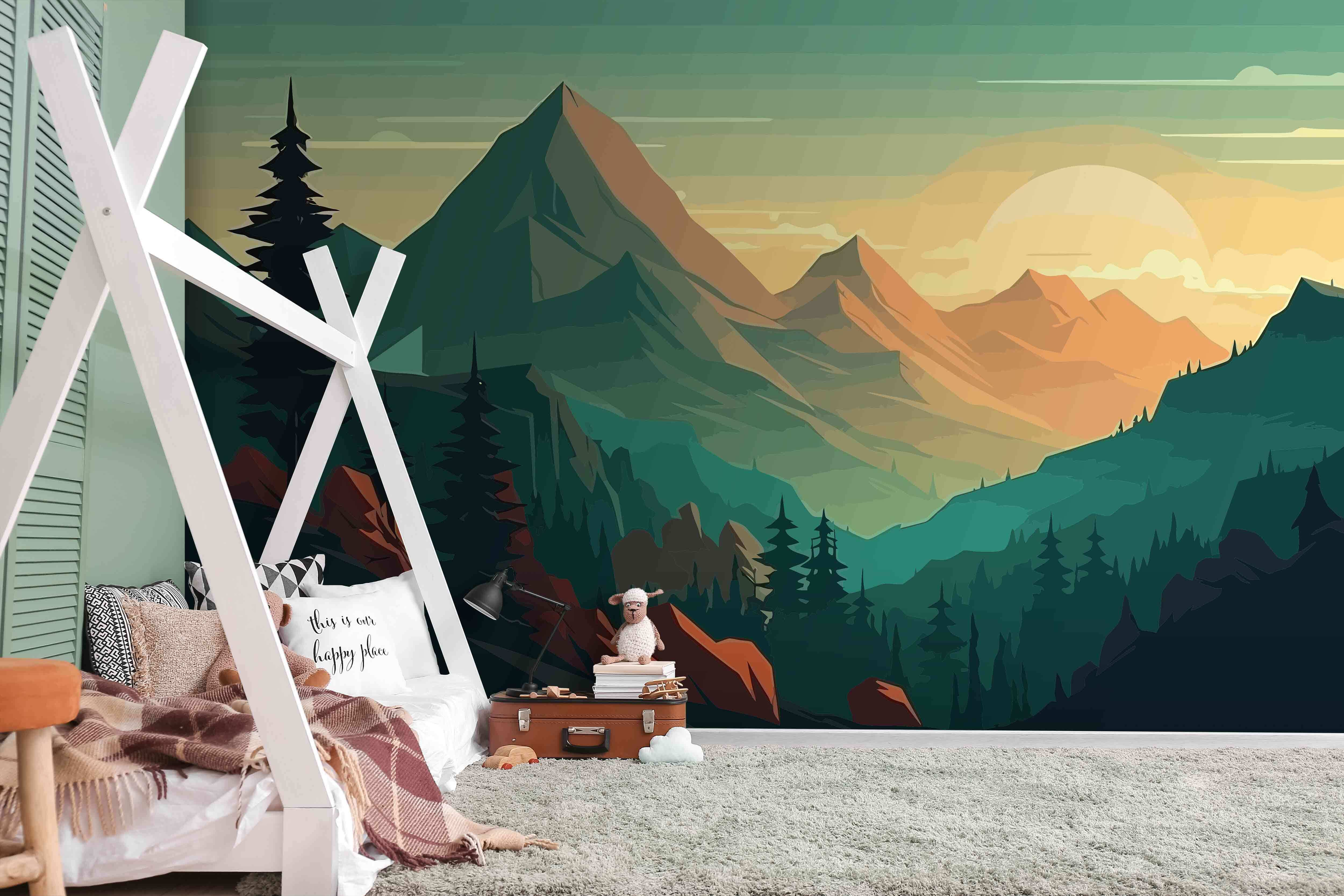 Transform any room with this stunning wall mural featuring a breathtaking landscape of mountains and trees. Imagine waking up to the soft glow of sunrise peeking over majestic peaks, the rich greens and warm tones creating a cozy, natural vibe. It’s like bringing the great outdoors right into your living space. Whether it’s a serene office or a calming bedroom, this mural invites adventure and tranquility. Picture sipping coffee, daydreaming while gazing at your very own slice of nature. Perfect for those who crave a bit of the wild without the trek. What’s not to love?