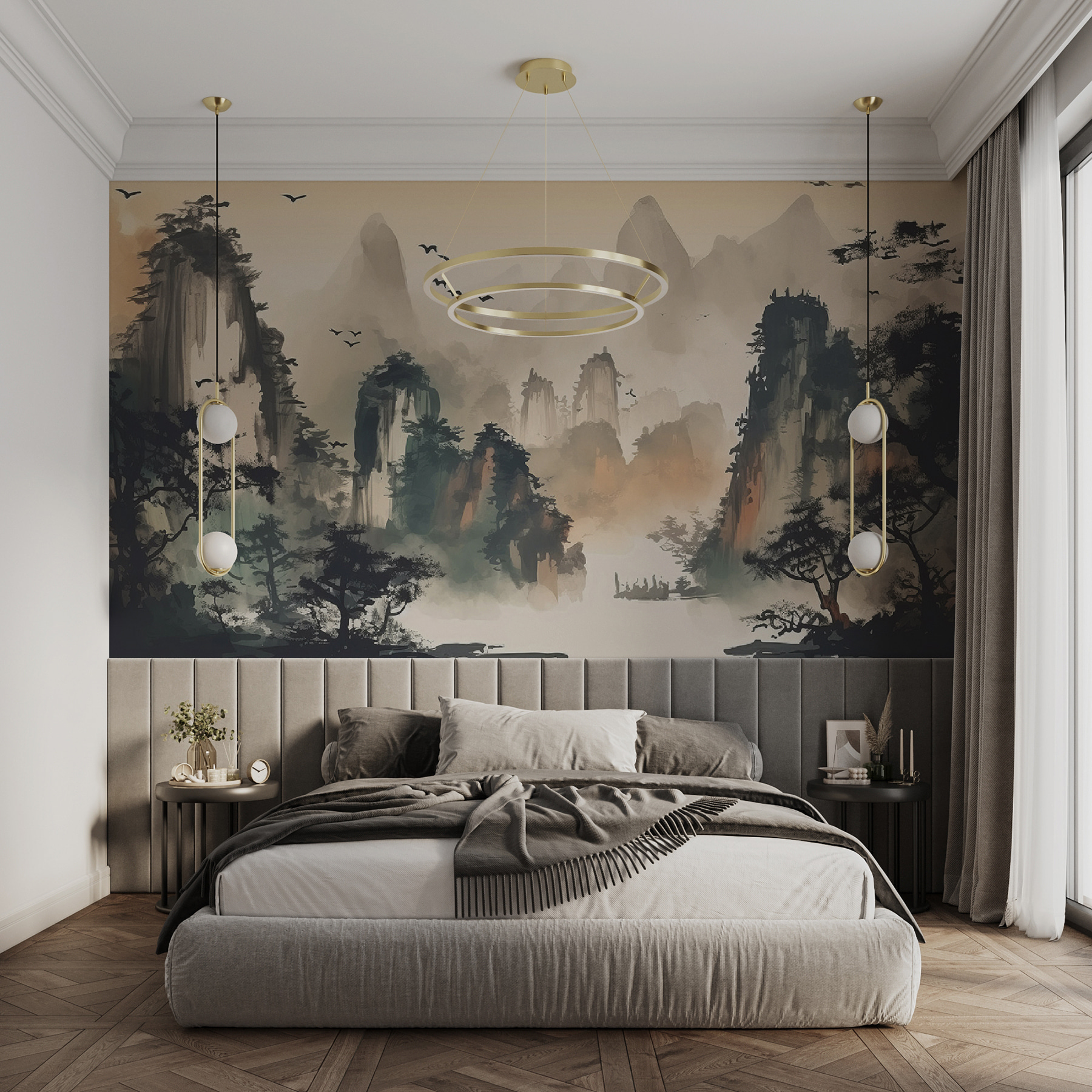 Transform any room into a serene escape with this enchanting wall mural, showcasing majestic trees and mountains that seem to breathe life into your space. Imagine cozying up with a cup of tea, daydreaming while gazing at the misty peaks and gentle shadows. It’s like bringing a slice of nature indoors—minus the bugs and mud, thankfully! The soft colors create a calm vibe, perfect for chill evenings or a creative spark. Let this mural whisper stories of adventure and tranquility, and invite nature’s peace right into your home. Who knew wall art could be this magical?