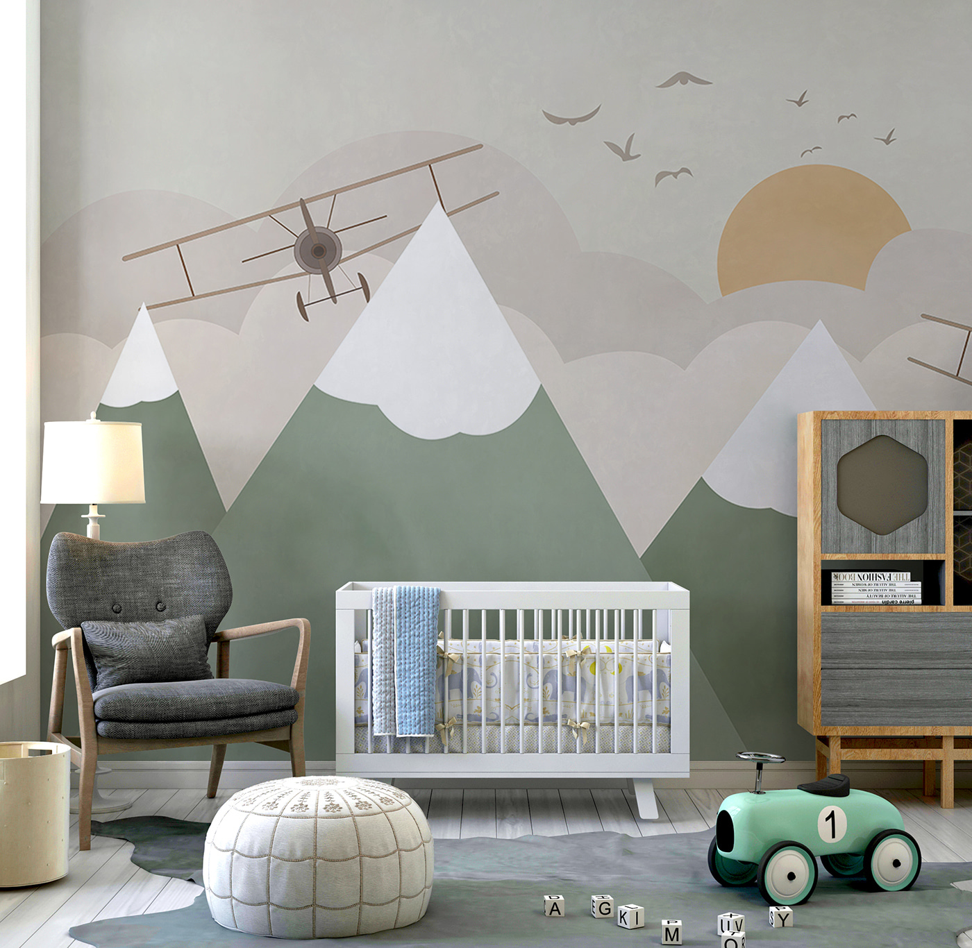 The soft, muted colors create a soothing atmosphere, perfect for relaxing or bedtime stories. Imagine snuggling up, gazing at those planes and mountains, sparking conversations about far-off places and imaginary journeys. It’s like having a little piece of the sky right on the wall, encouraging dreams and creativity with every glance.