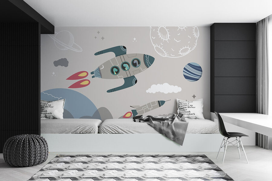Transform your space with this playful mural of dinosaurs exploring the cosmos in their rockets! Imagine a T-Rex peeking through a spaceship window, ready for adventure. This quirky design brightens up any room and stirs the imagination—perfect for kids’ rooms, play areas, or even a cool accent wall for the young at heart. It’s not just decor; it inspires daydreams of interstellar journeys and dino paloozas in outer space. Plus, who wouldn’t want their wall to whisper tales of exploration? Just picture yourself lounging there, gazing at the stars and smiling at those charming dino astronauts. A delightful escape right at home!