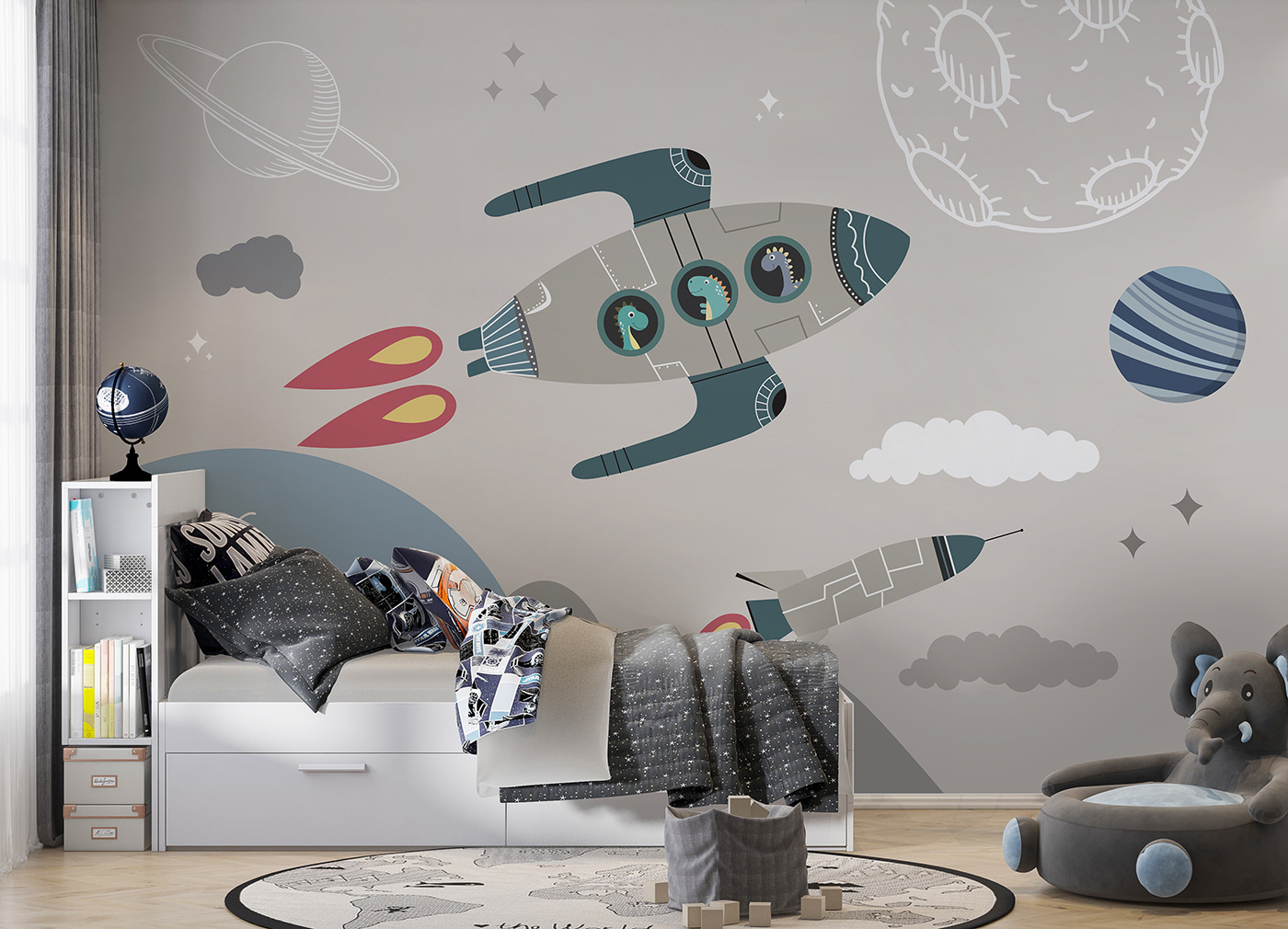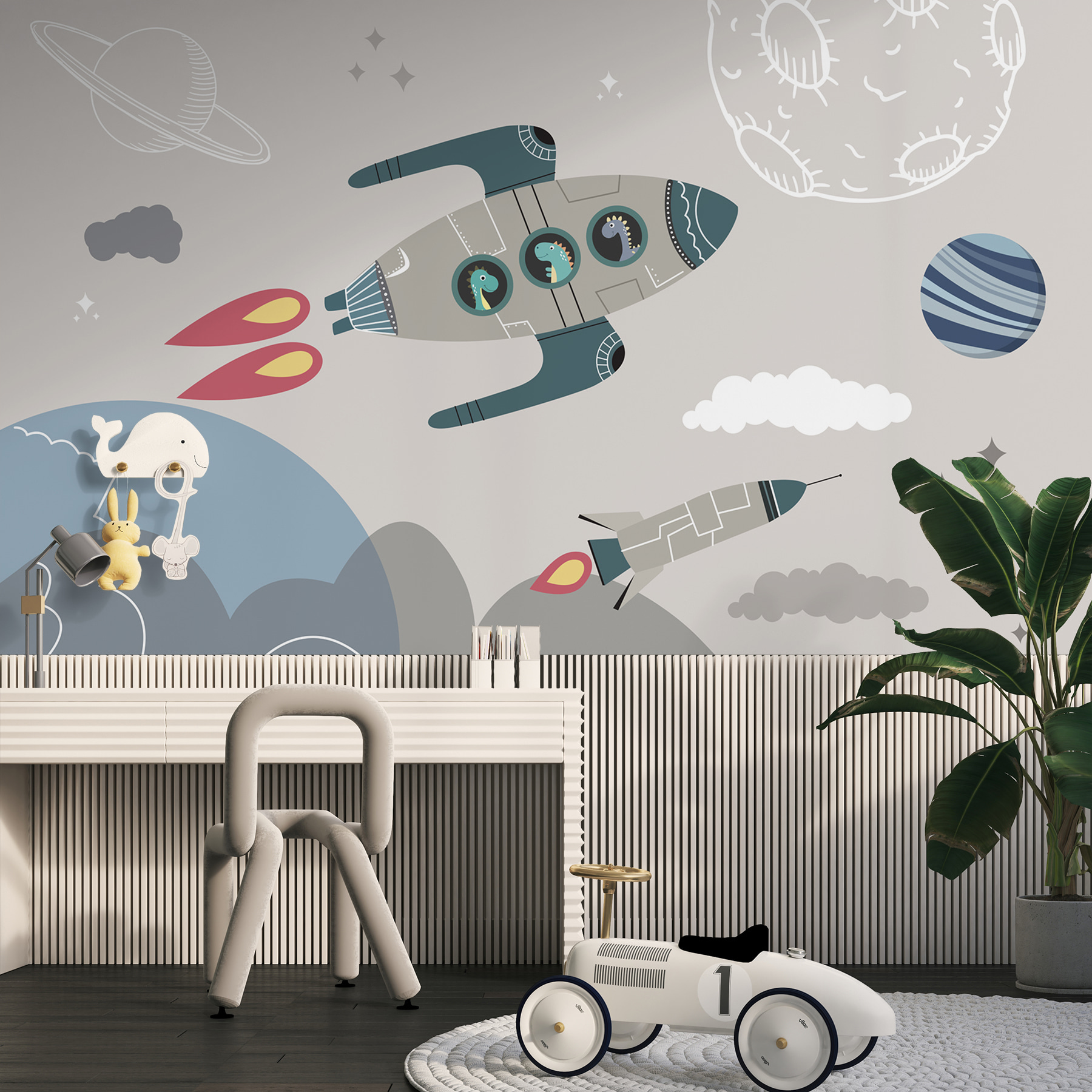Transform your space with this playful mural of dinosaurs exploring the cosmos in their rockets! Imagine a T-Rex peeking through a spaceship window, ready for adventure. This quirky design brightens up any room and stirs the imagination—perfect for kids’ rooms, play areas, or even a cool accent wall for the young at heart. It’s not just decor; it inspires daydreams of interstellar journeys and dino paloozas in outer space. Plus, who wouldn’t want their wall to whisper tales of exploration? Just picture yourself lounging there, gazing at the stars and smiling at those charming dino astronauts. A delightful escape right at home!