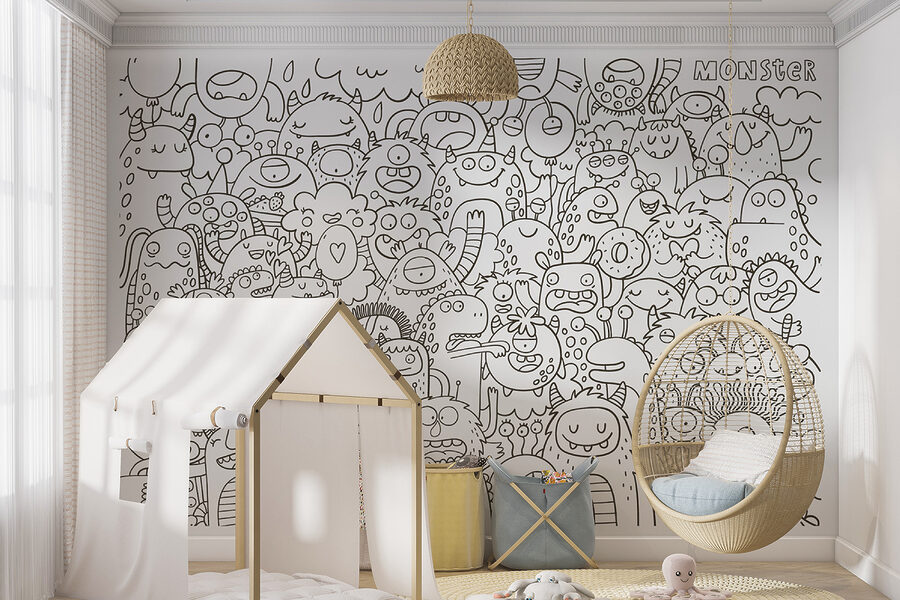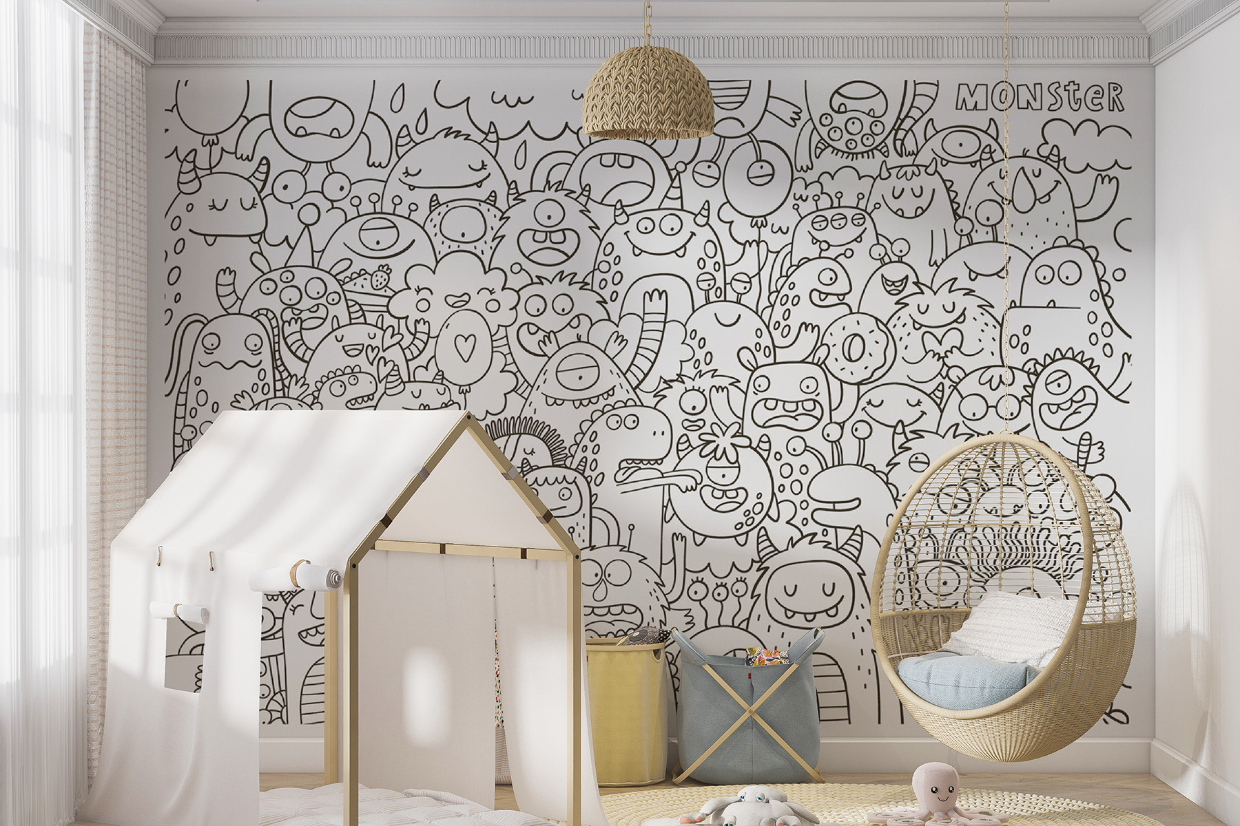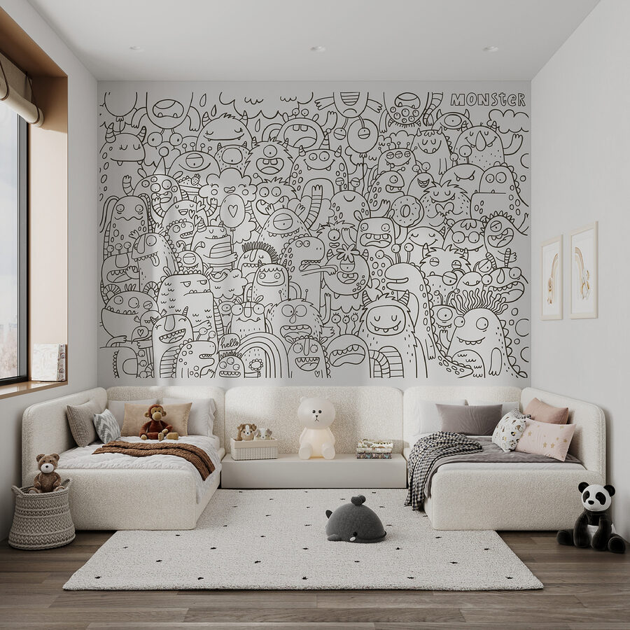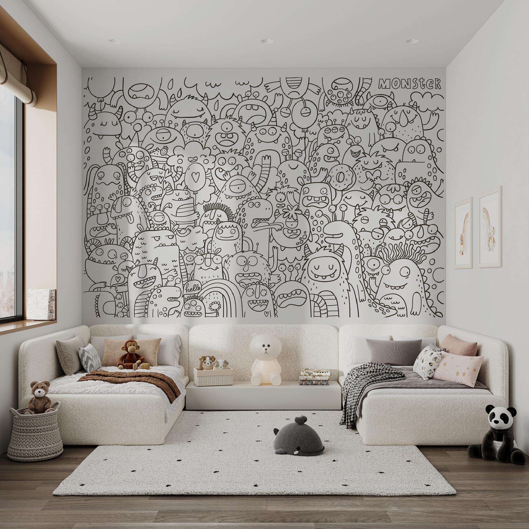 Bring a playful touch to your walls with this quirky black line drawing mural. Imagine walking into your room and being greeted by a vibrant crowd of friendly monsters, each with their own silly expressions. It’s like having a party, but without the mess!